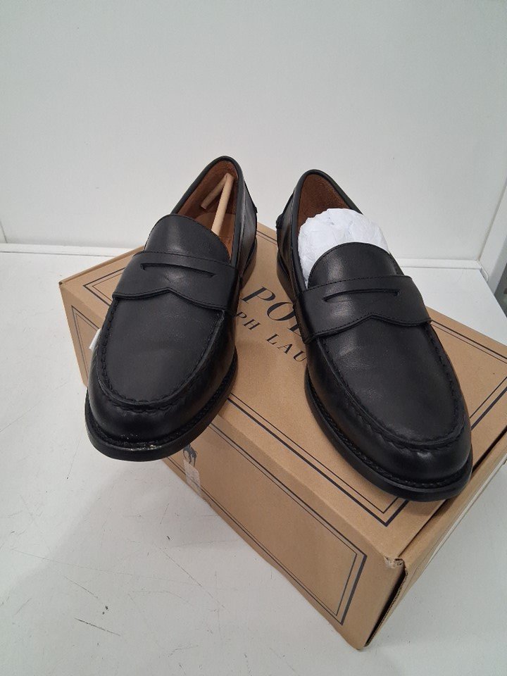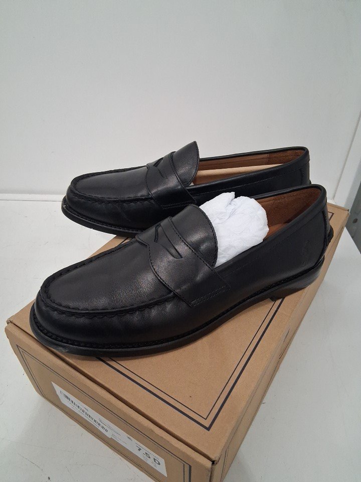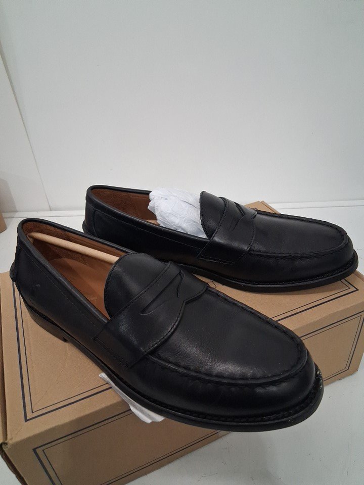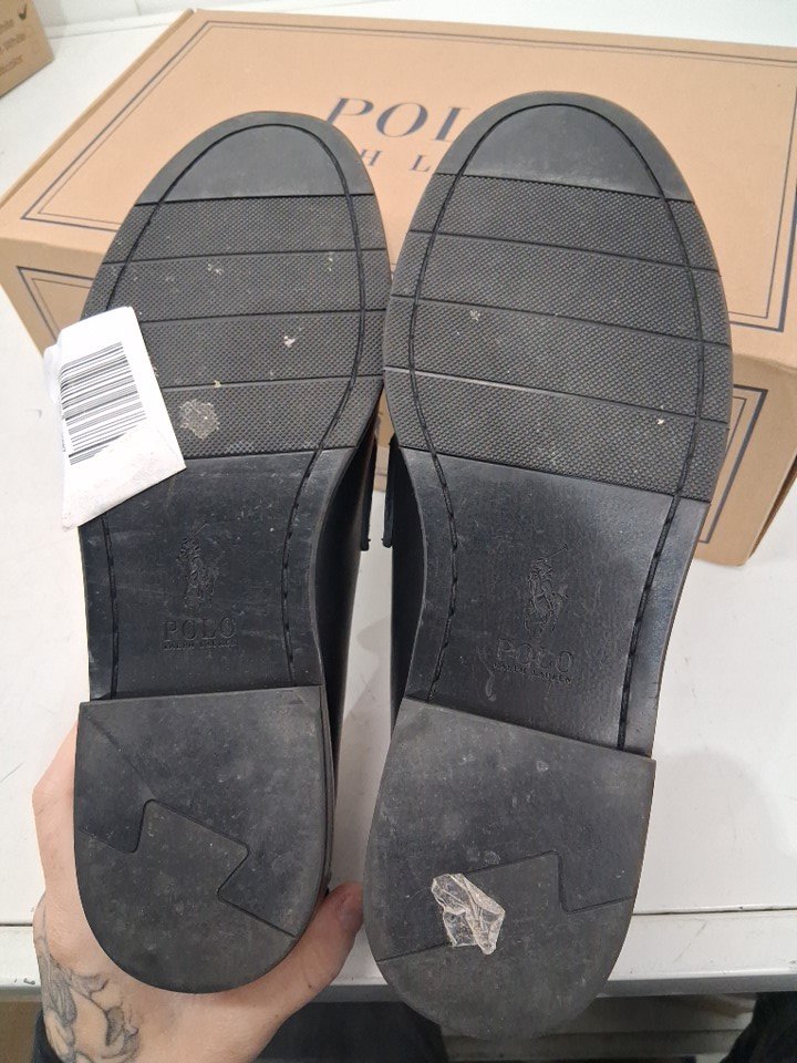 Right loafer has white stain on toe, and soles have visible dirt discoloration