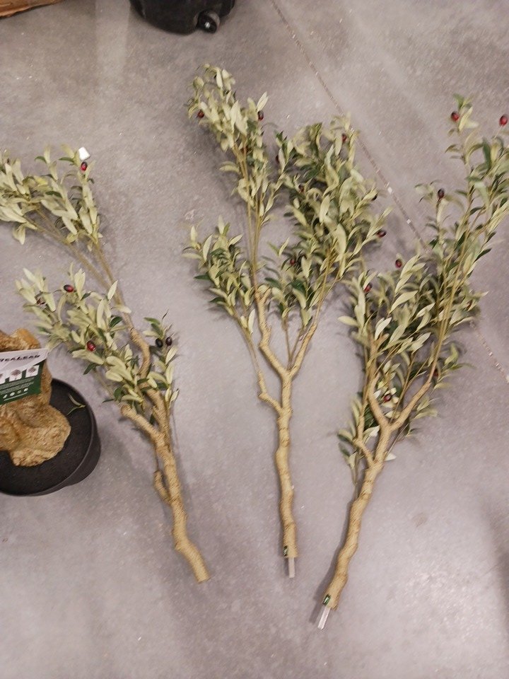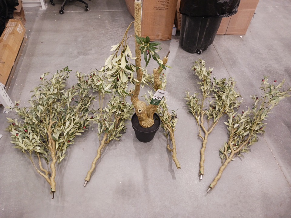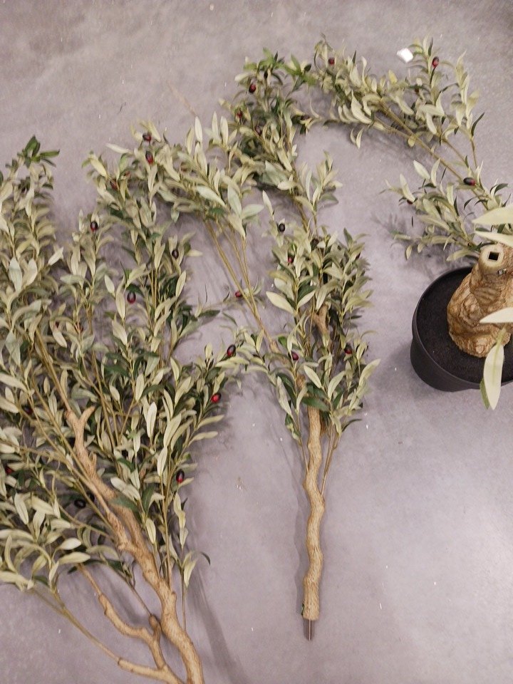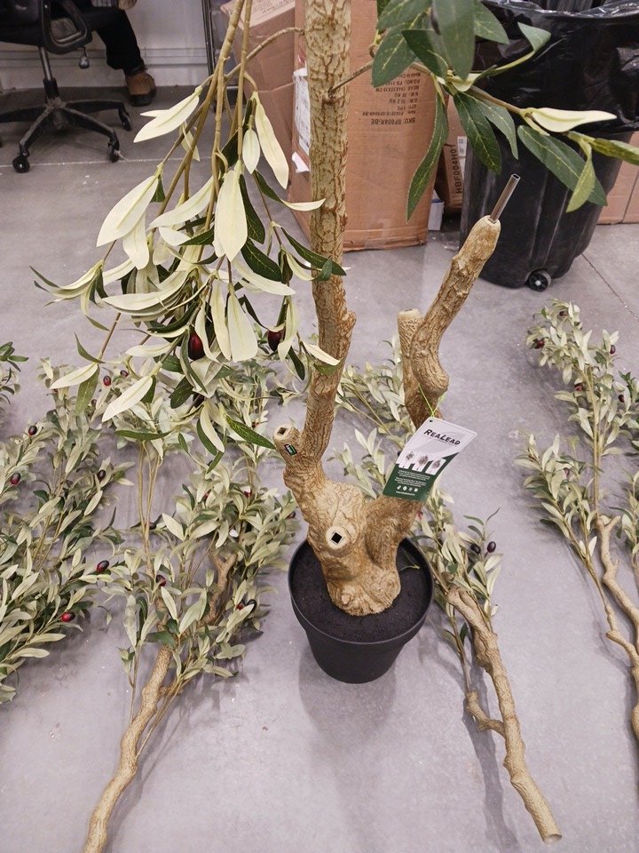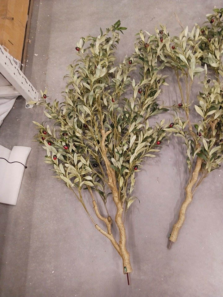 A few of the decorative olive pieces have come loose from the branches, likely due to prior handling or transport. However, the overall structure of the tree remains intact, stable, and in great shape.