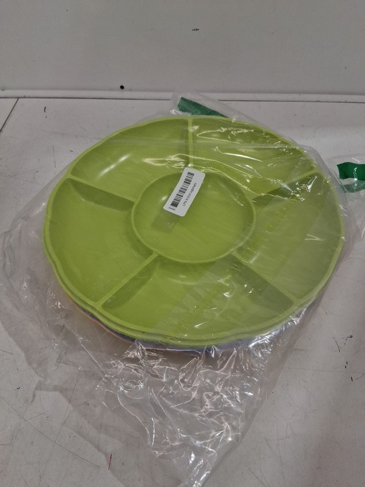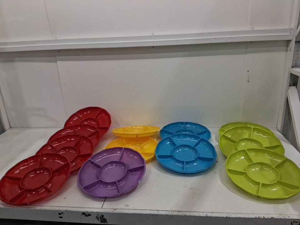 12PK Disposable Plastic Appetizer Serving Platter with six sectional divers 12" - multicolor