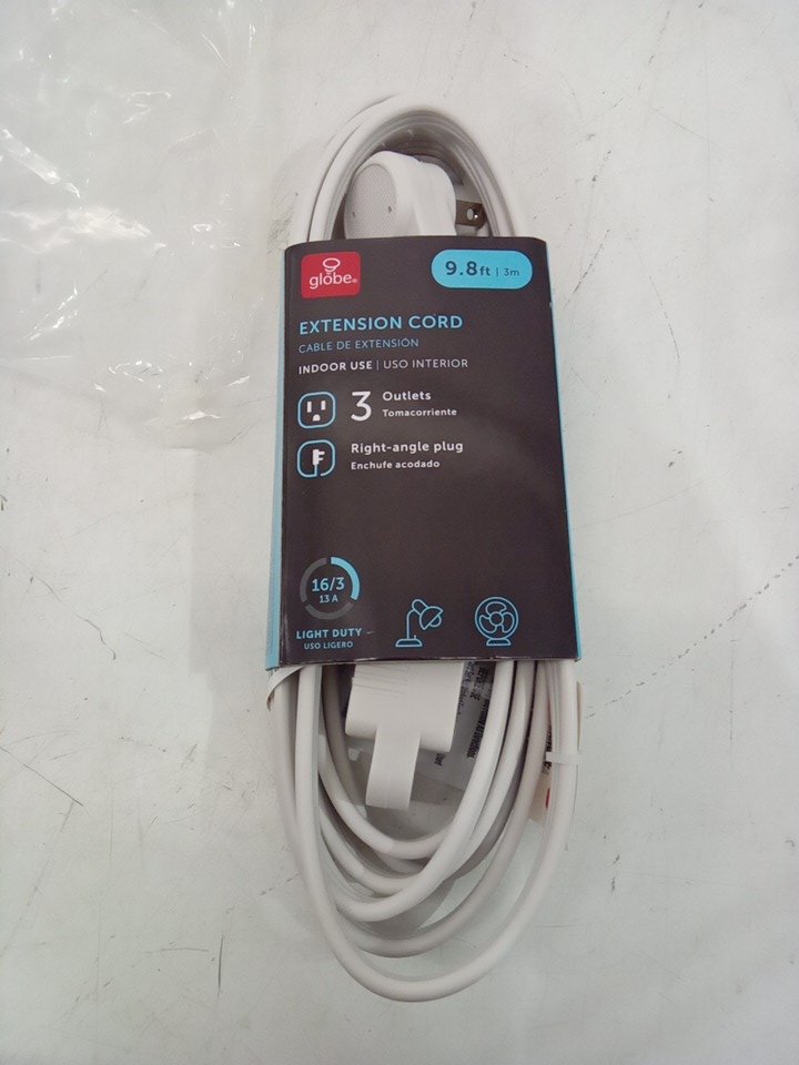 GLOBE ELECTRIC 3-OUTLET INDOOR EXTENSION CORD WITH RIGHT-ANGLE PLUG - GROUNDED - 9.8FT - WHITE