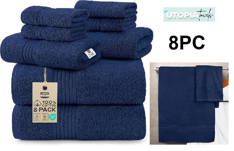 8PC UTOPIA 600GSM HIGHLY ABSORBANT RING-SPUN TOWEL SET - 2 BATH TOWELS, 2 HAND TOWELS AND 4 WASHCLOTHS - navy blue