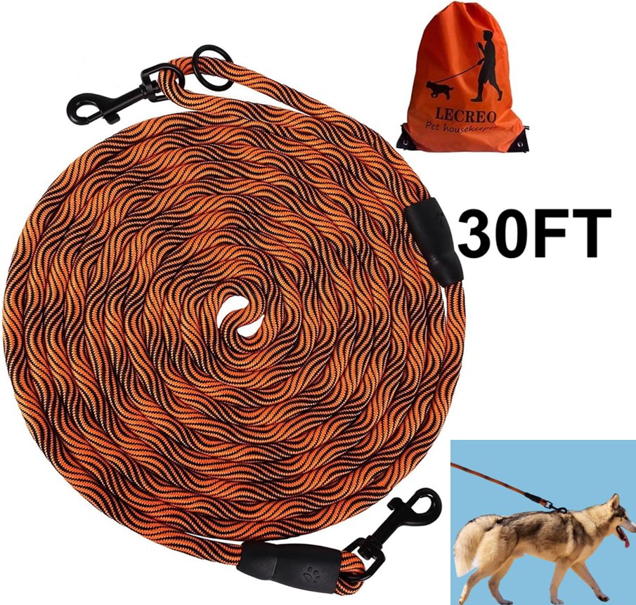 Lecreo heavy duty recall/training dog leash tie-out rope - 30ft - orange/black