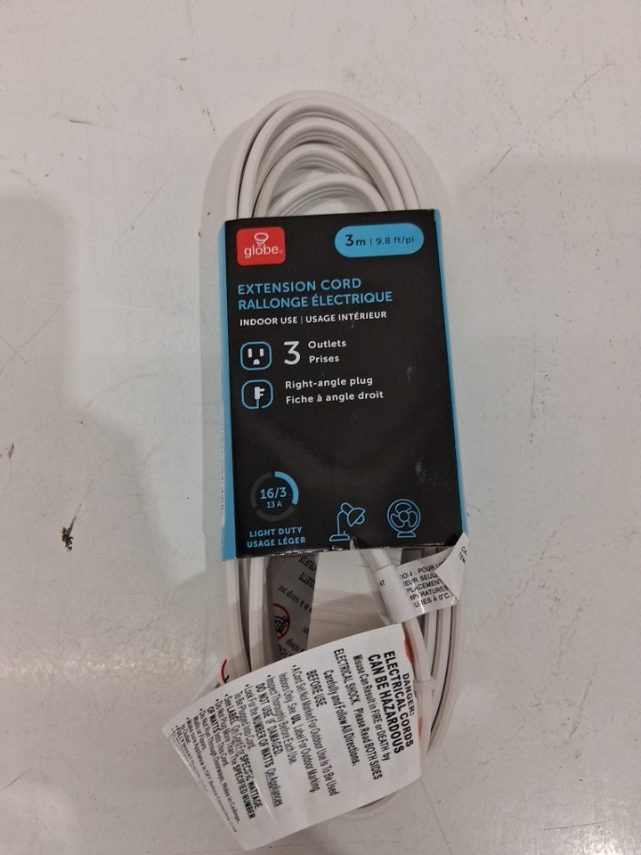 GLOBE ELECTRIC 3-OUTLET INDOOR EXTENSION CORD WITH RIGHT-ANGLE PLUG - GROUNDED - 9.8FT - WHITE