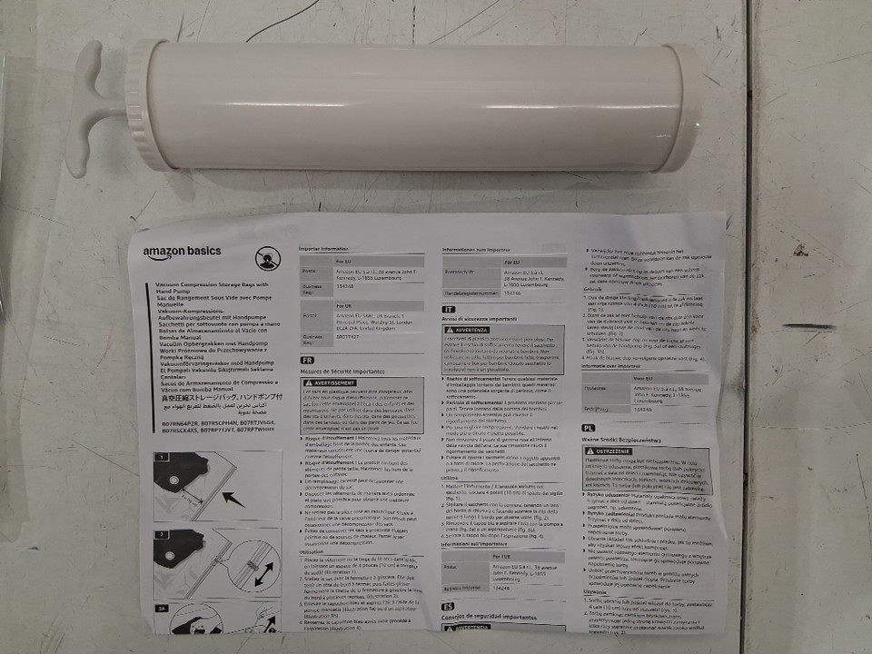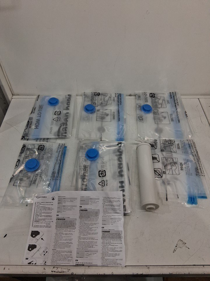 6PK AMAZONBASICS VACUUM COMPRESSION STORAGE BAGS WITH HAND PUMP - ( 2 ) MEDIUM, ( 2 ) LARGE, AND ( 2 ) JUMBO