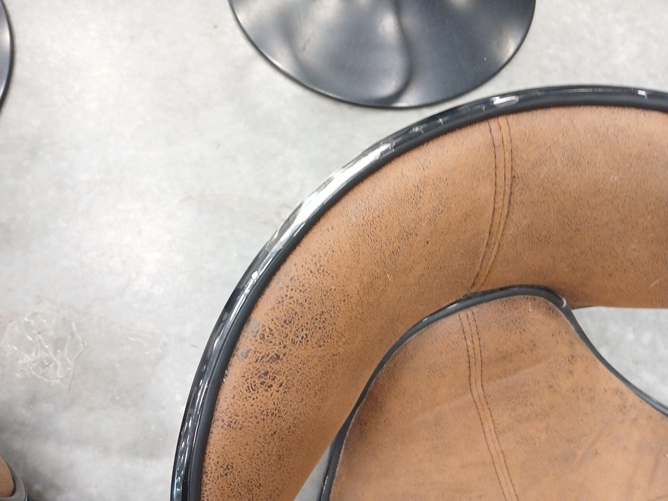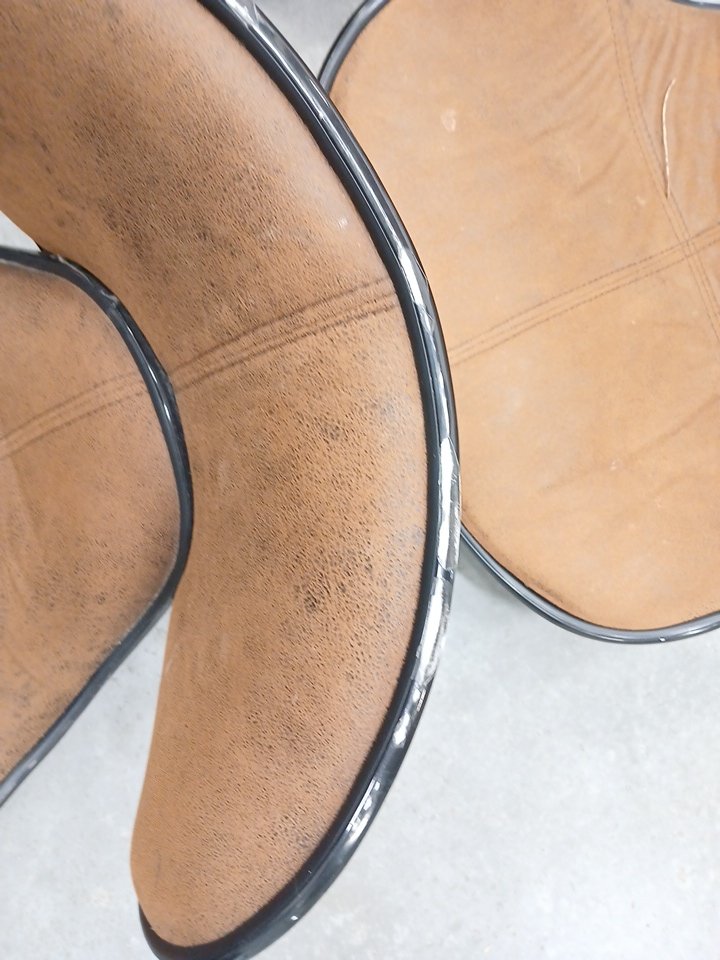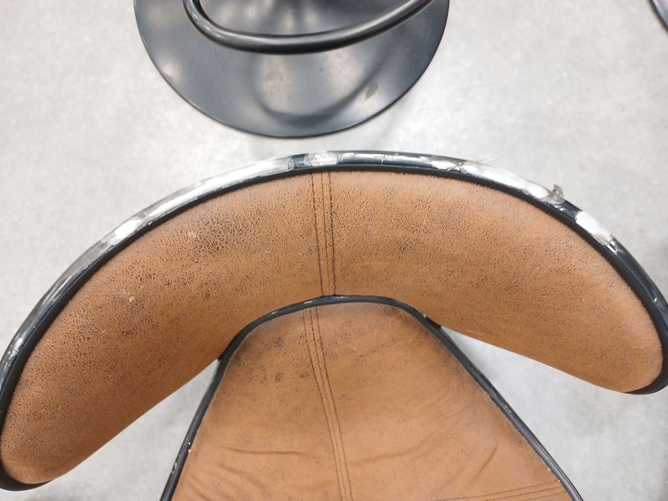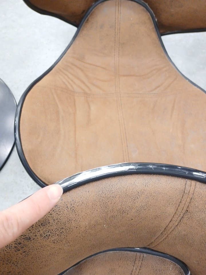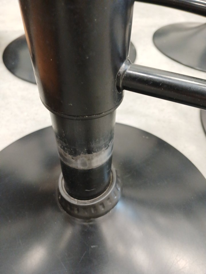 This item has scratches and scuffs to its base, the black trim on the seat is chipping, and the item is dirty and has some staining. The seats have some wrinkling and the base shaft is discolored.