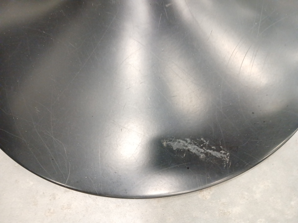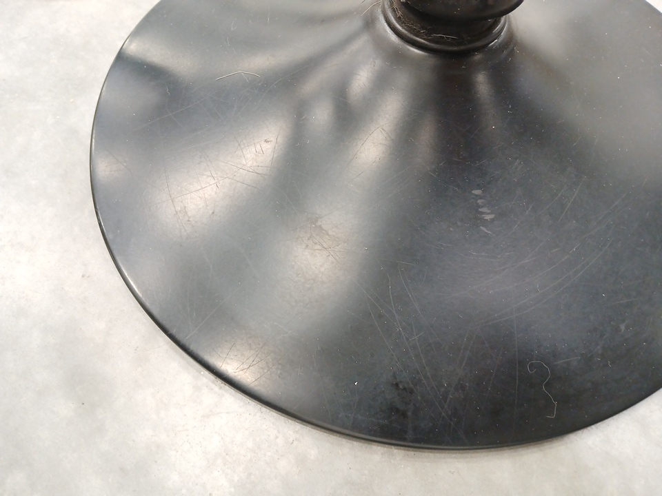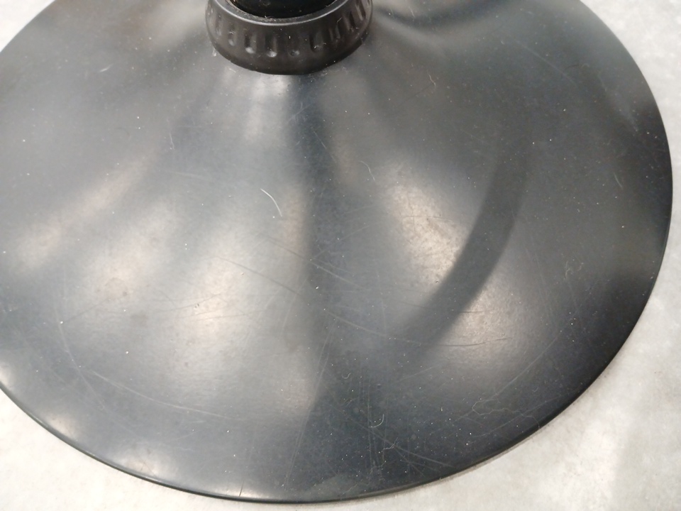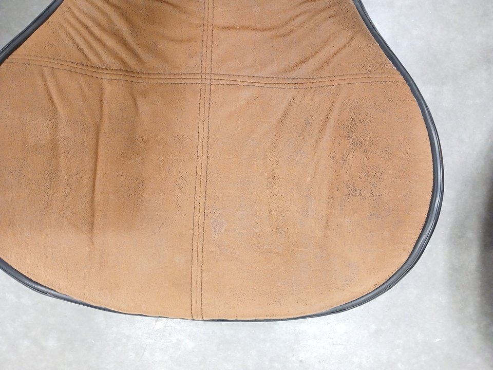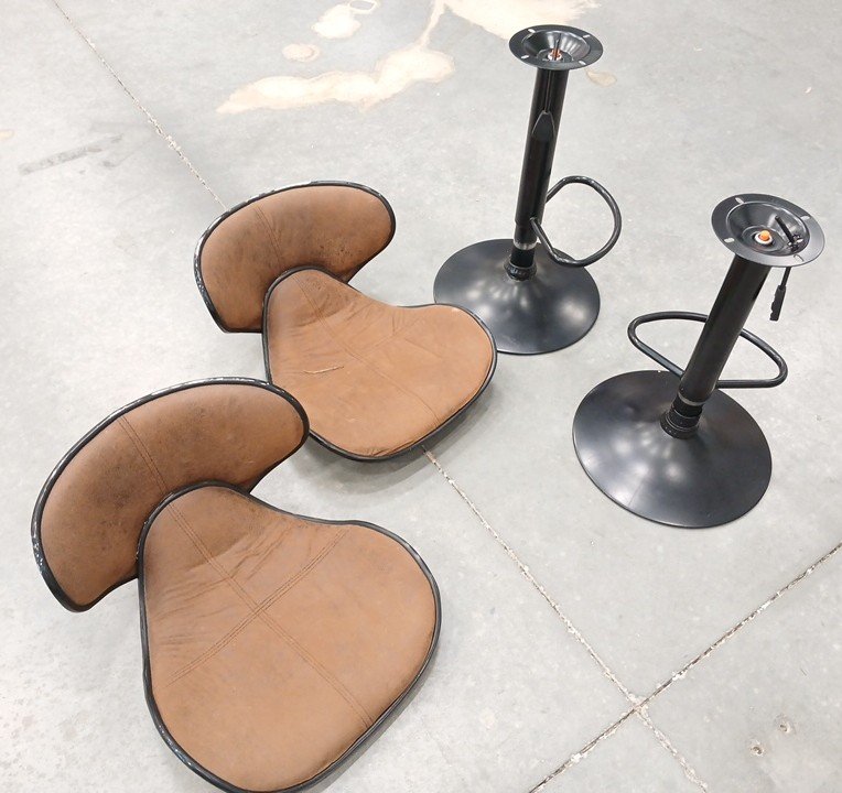 This item has scratches and scuffs to its base, the black trim on the seat is chipping, and the item is dirty and has some staining. The seats have some wrinkling and the base shaft is discolored.