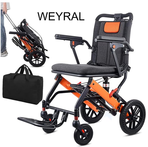 WEYRAL Super Lightweight Portable Transit Travel Wheelchair - with Telescopic Handle and Travel Bag - Orange + Black - (MODEL:Z80)