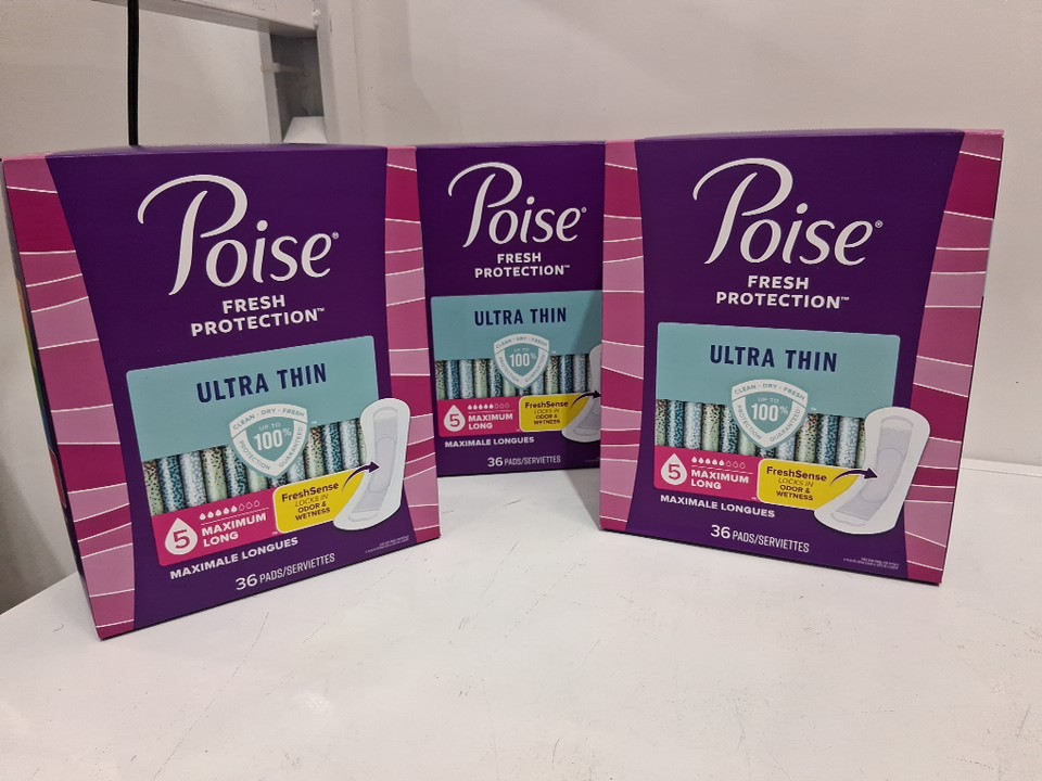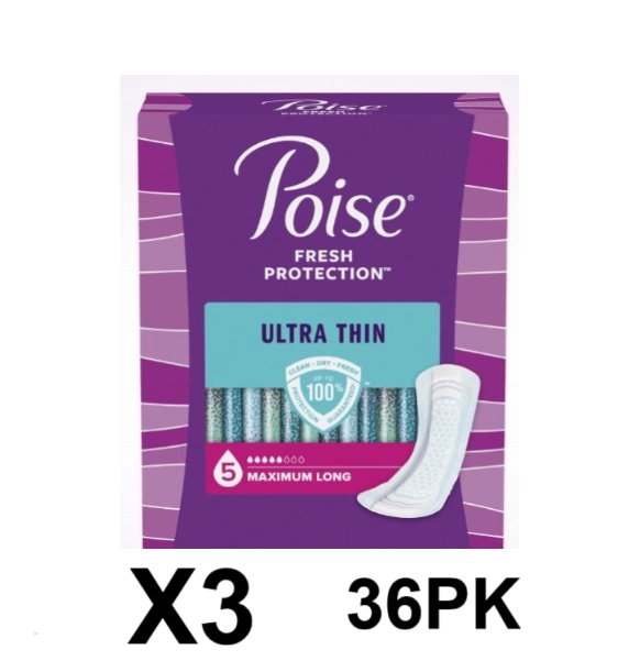 3(36PK) POISE Fresh Protection Ultra-Thin Pads for Bladder Leaks - 5 Drop Maximum Absorbency - Long Length
