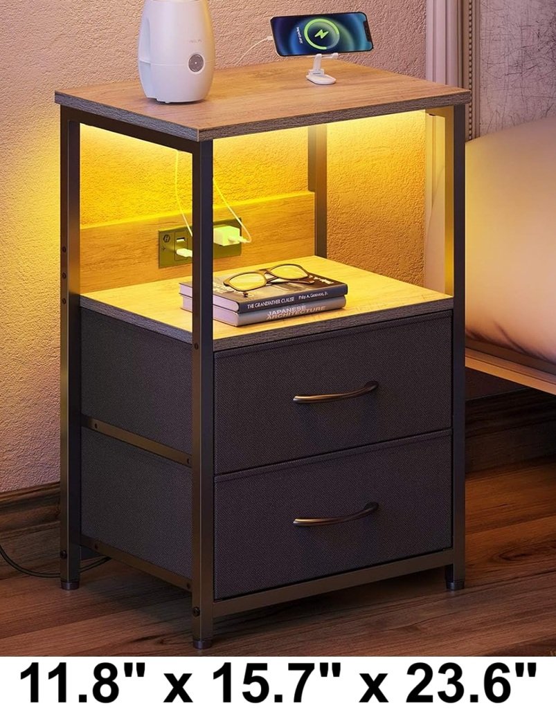Seventable 3-Tier 2 Fabric Drawer Bedside Table Nightstand with Charging Station and LED Lights - 11.8" x 15.7" x 23.6" - Greige (Model: ED014-GE40-ST)