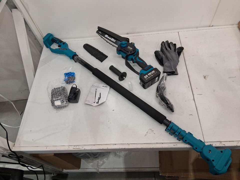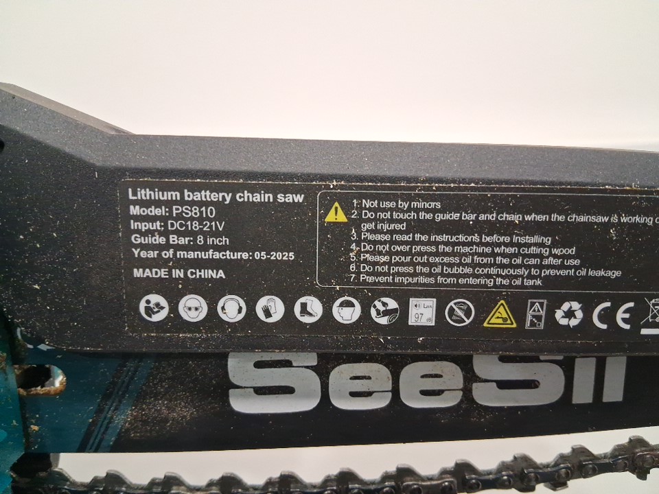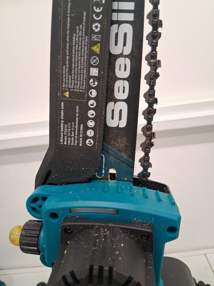 Small amount of sawdust on blade and saw connection indicates prior short-term use. (See photos)