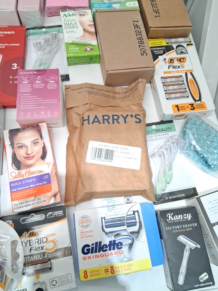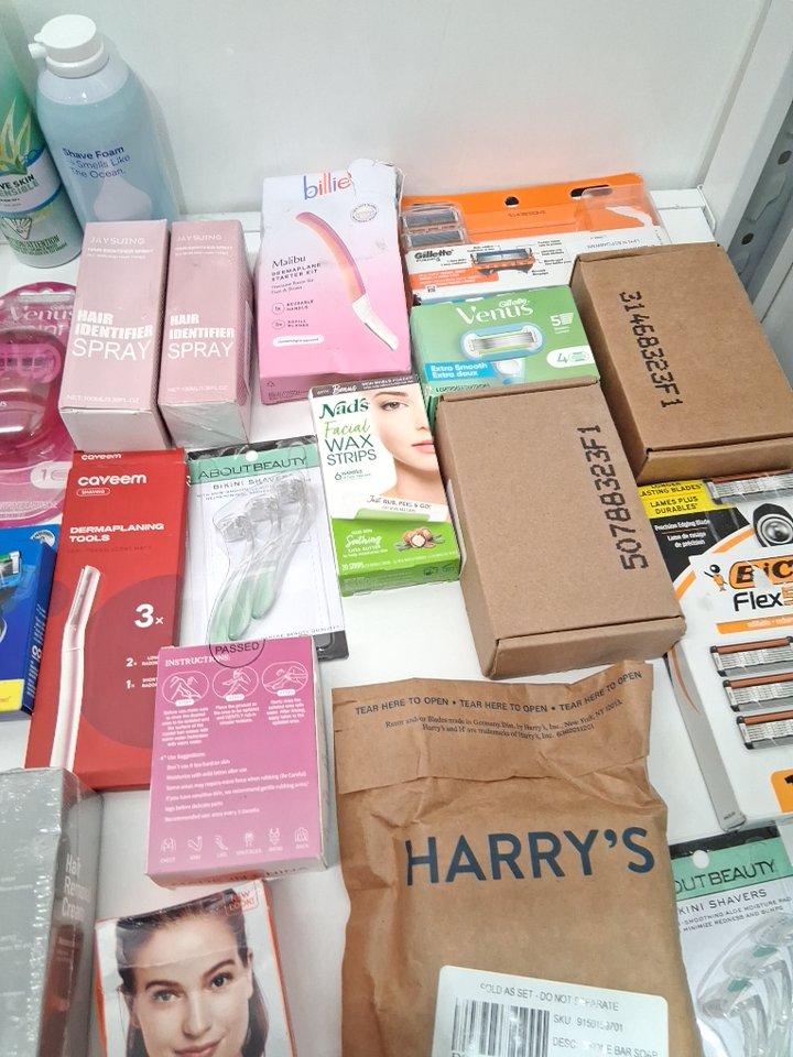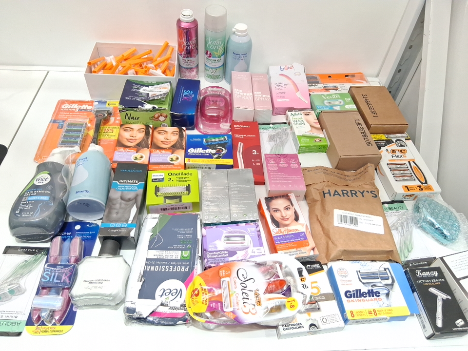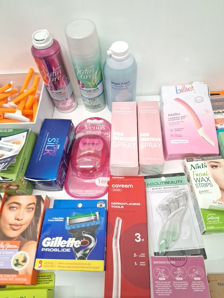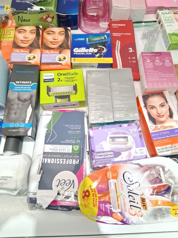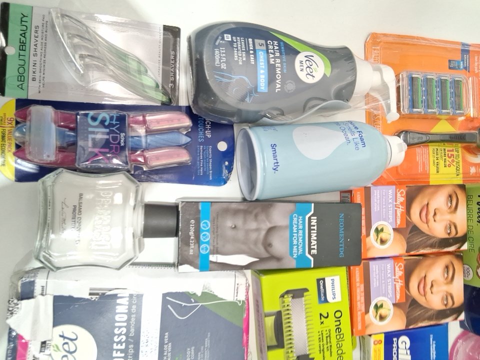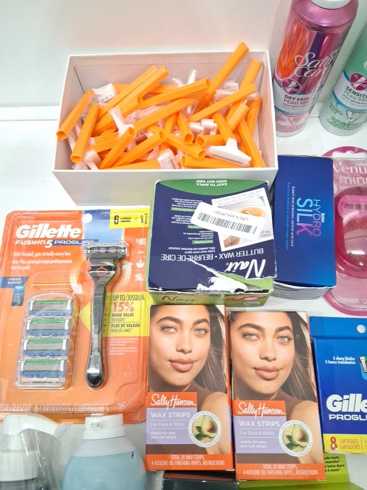 30+ ASSORTED SHAVING AND WAXING PRODUCTS - WAX STRIPS, BLADE CARTRIDGES, HAIR REMOVAL CREAM, RAZORS, ETC. - VARIOUS BRANDS, TYPES