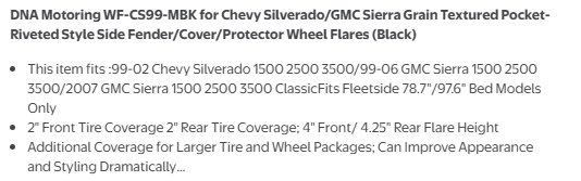 DNA Motoring Grain Textured Pocket-Riveted Style Side Fender - FOR CHEVROLET SILVERADO 1999-2002 - black (model: WF-CS99-MBK)