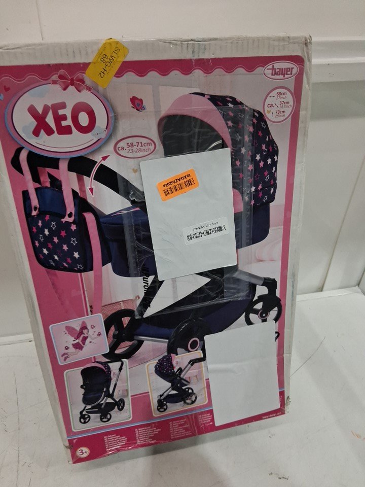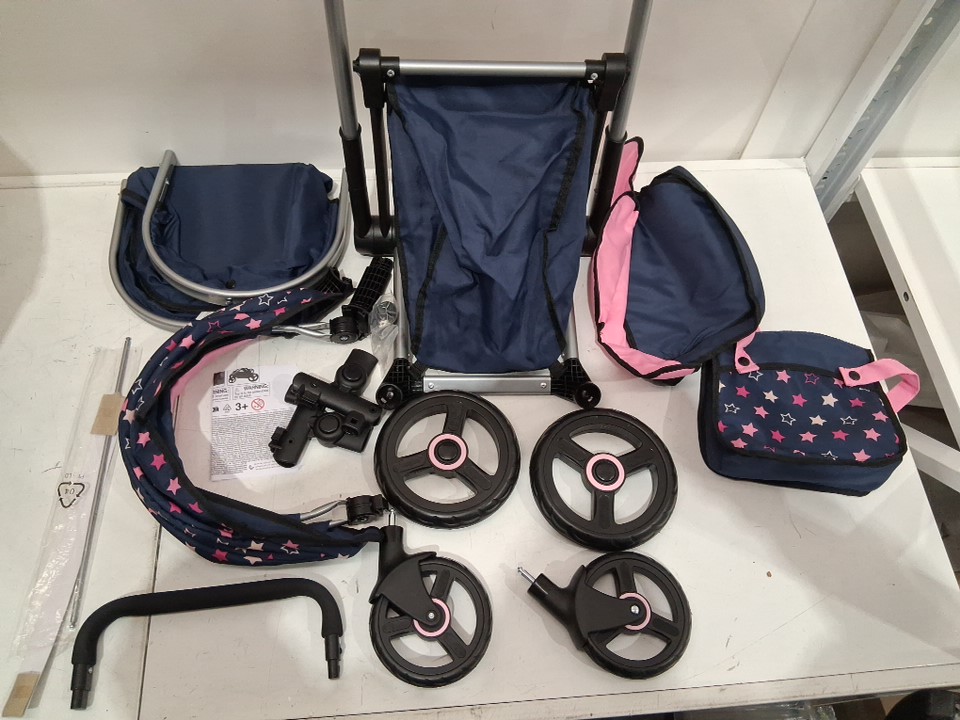 Kids Bayer xeo dolls pram/stroller with bag. Adjustable/reversible handle - Dolls up to 18" - Dark blue pink star - (model: 17016AA)