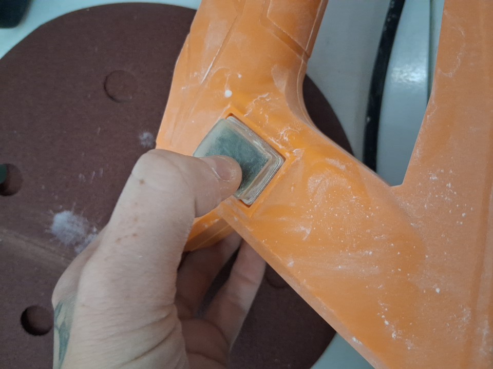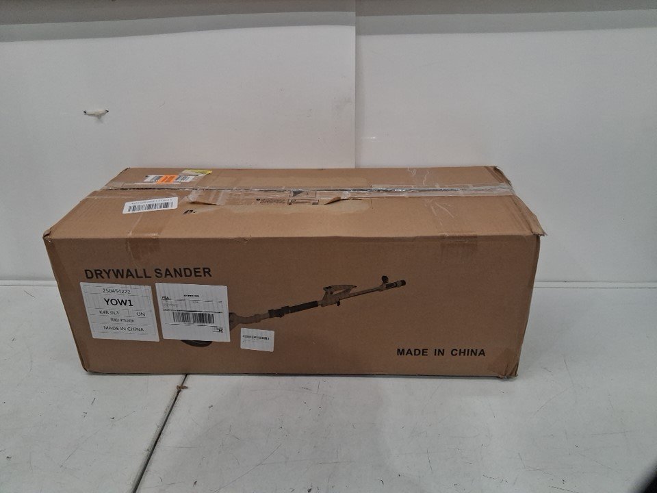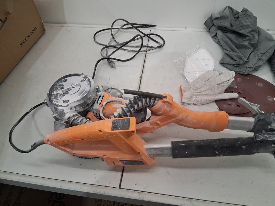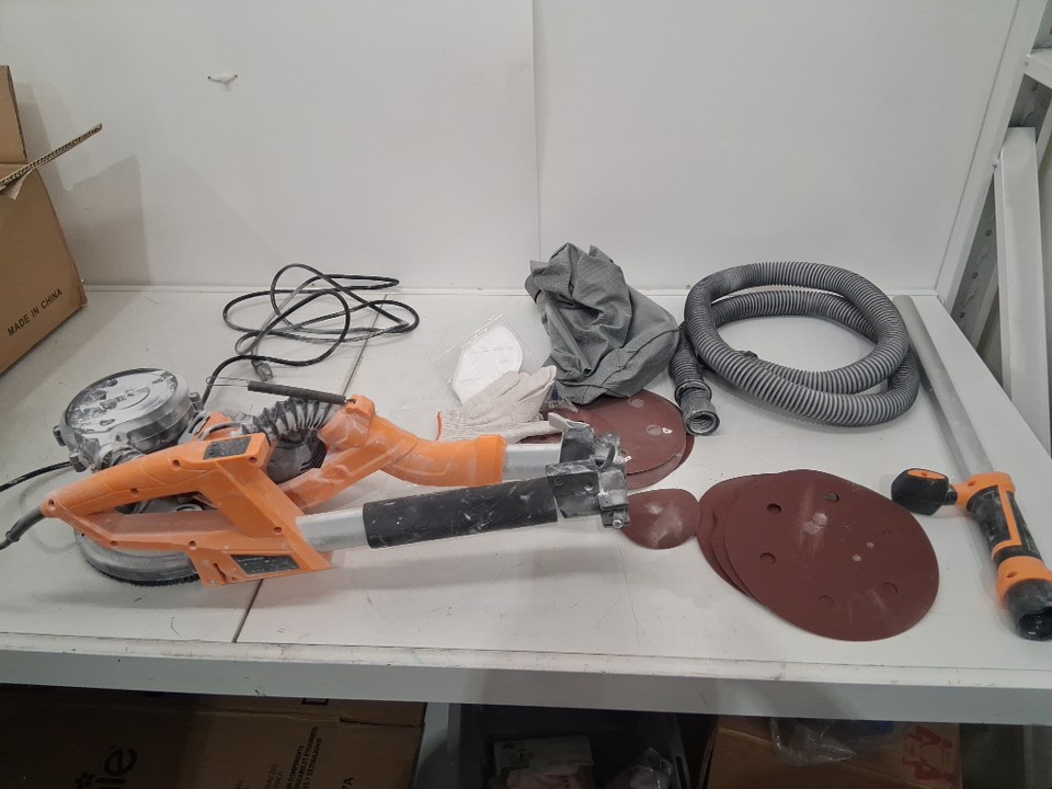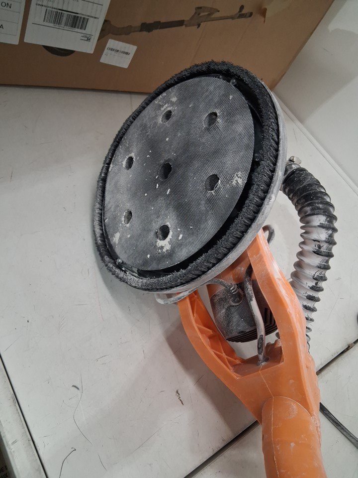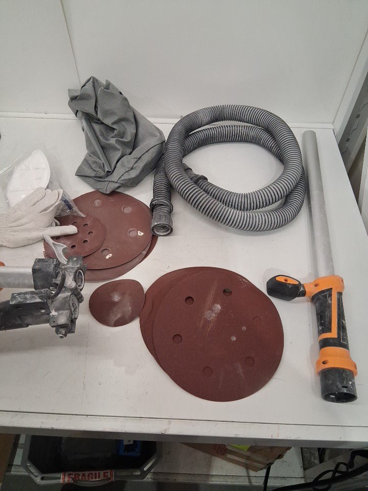 Drywall sander has drywall dust on it. Some sanding discs have drywall dust on them and others are unused. Has been tested for power
