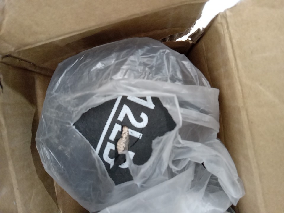 The coating on one of the dumbbells is cracking. Likely does not affect function.