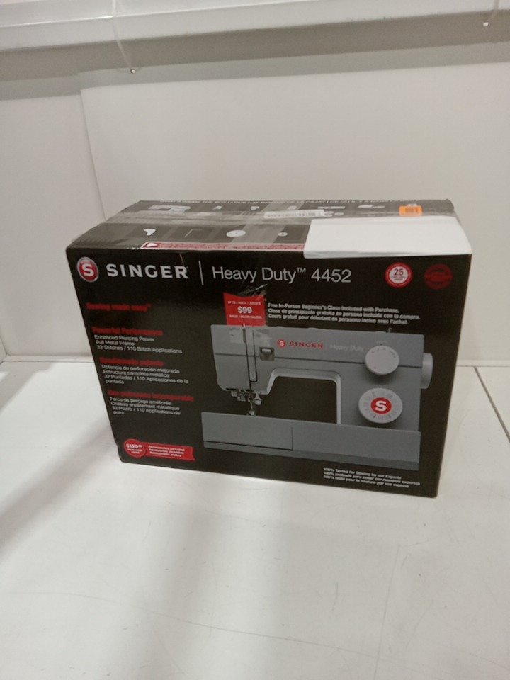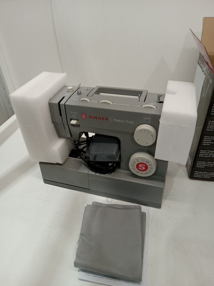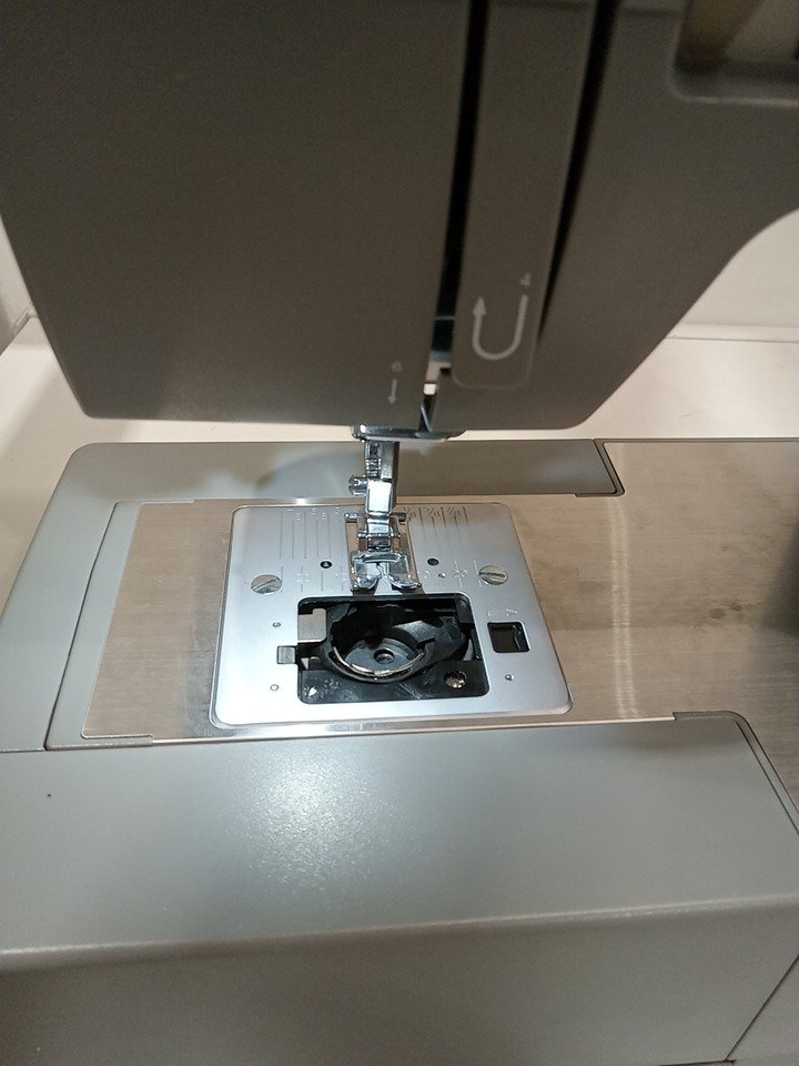 The spoke on the back is broken off, missing the plate by the needle and a screw in the carry handle. Tested for power/basic function.