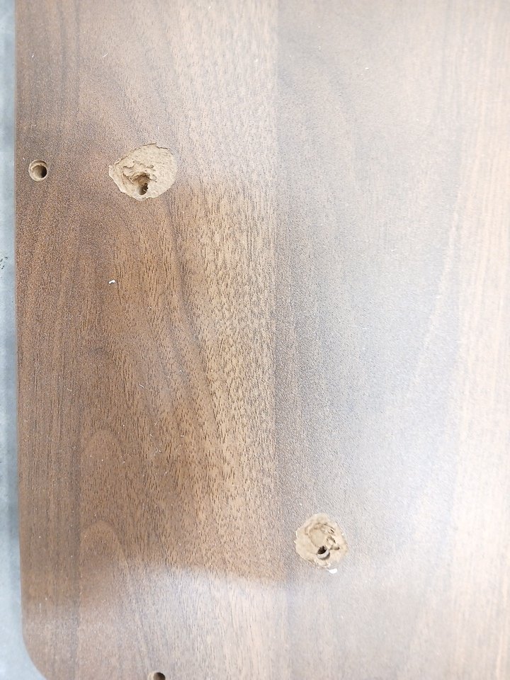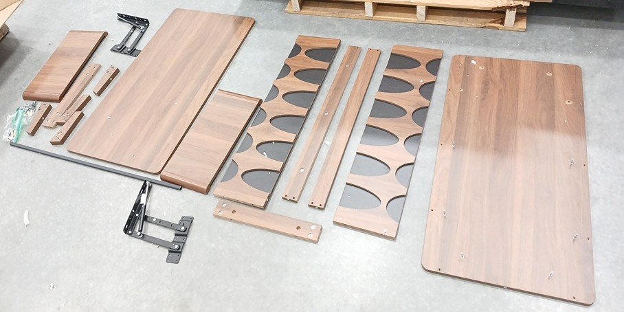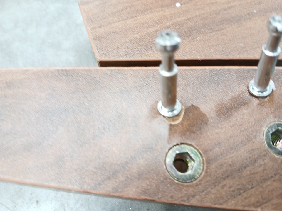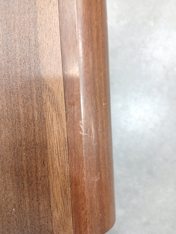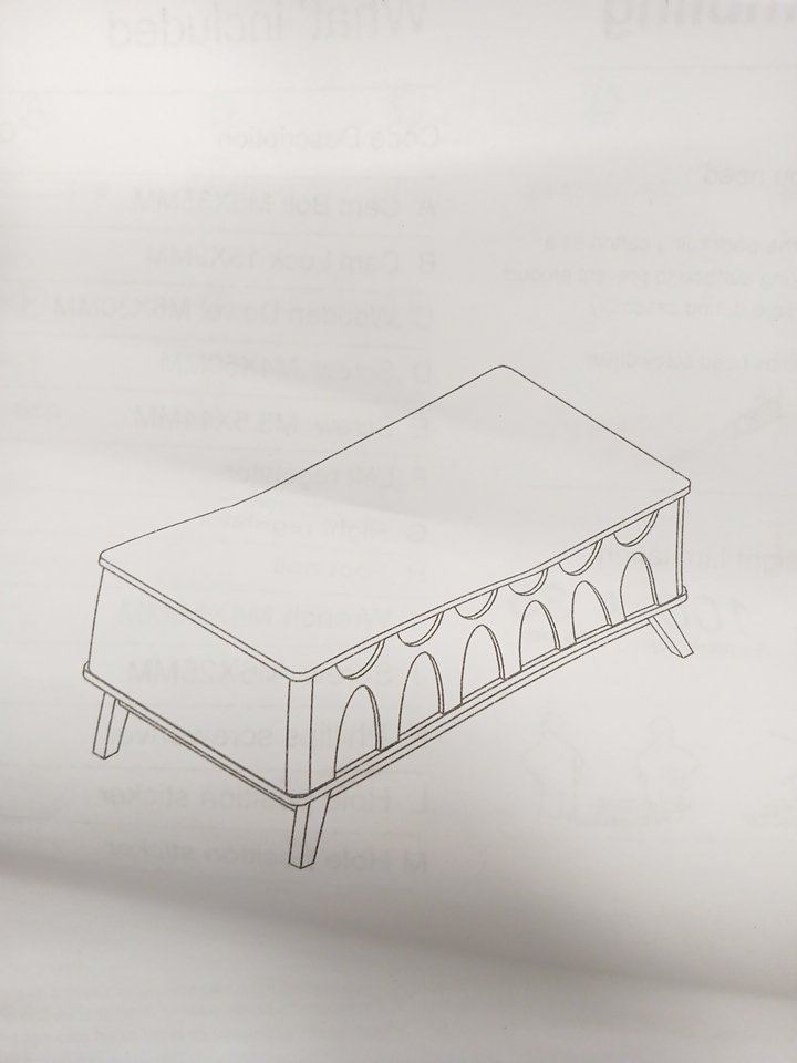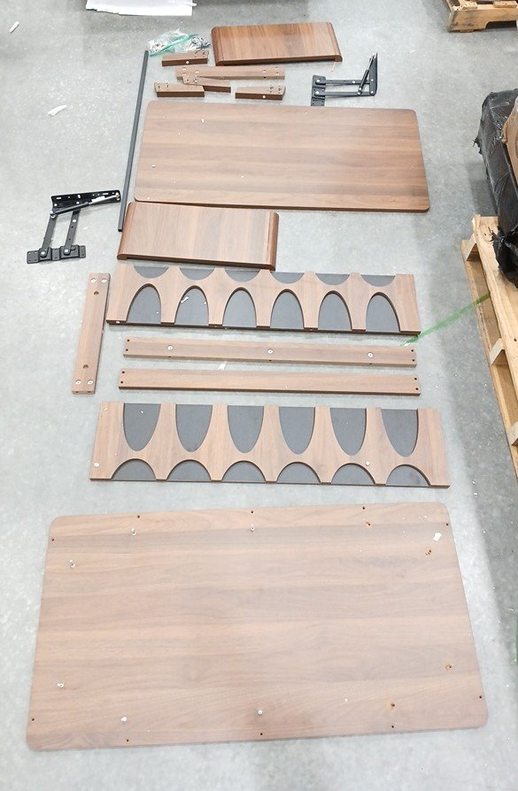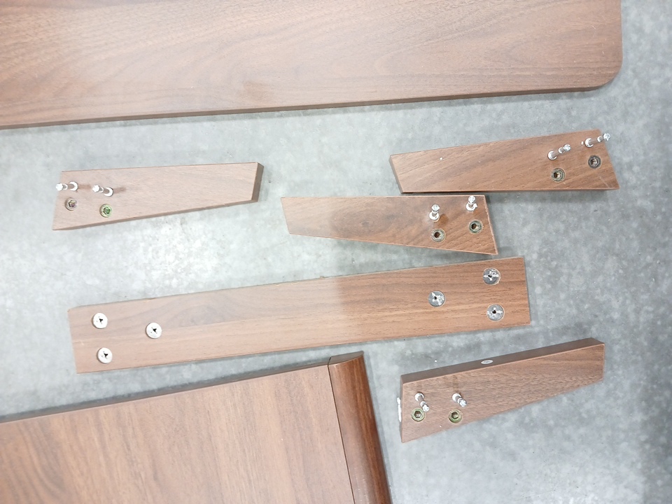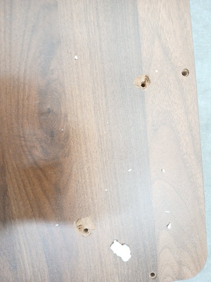 The underside of the table top has damage (see images). This item was previously assembled and has previous assembly marks with some hardware already attached. This item has scratches. Additional hardware ma y be required