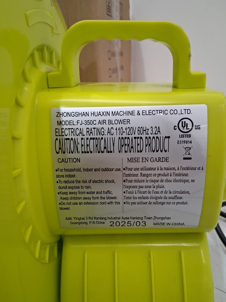 Air Blower Pump Fan for Inflatable Bouncers - 350w - green/yellow (model: fj-350c)