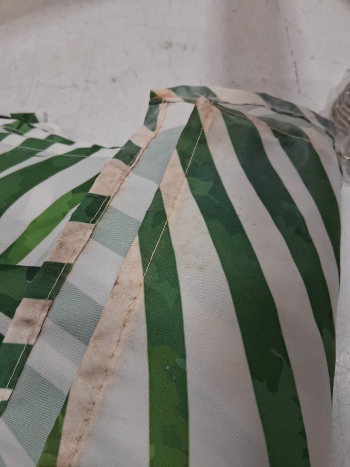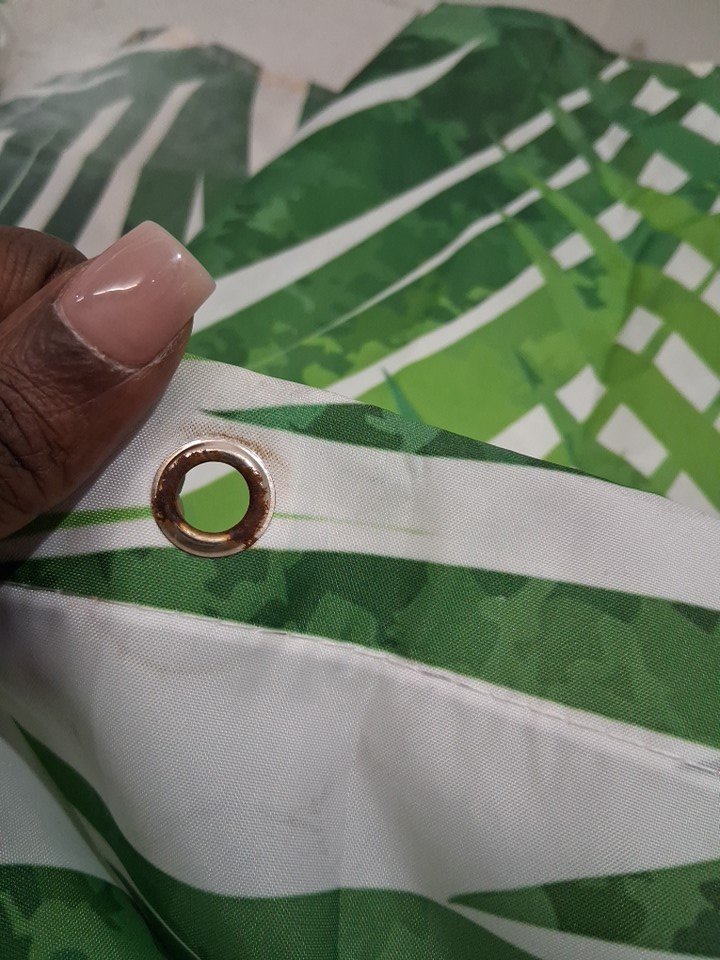 The item has rust on a few of the grommets and a stain at the bottom of the curtain, likely from shipping.