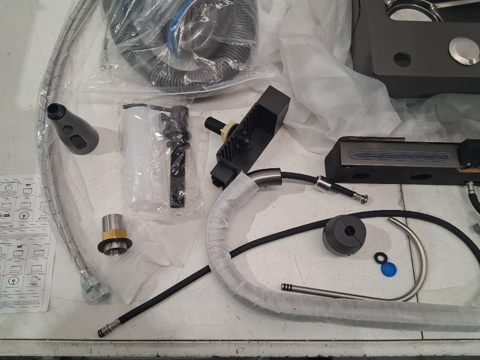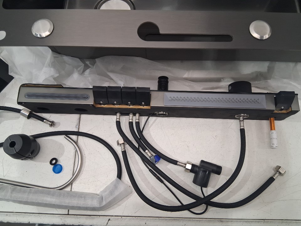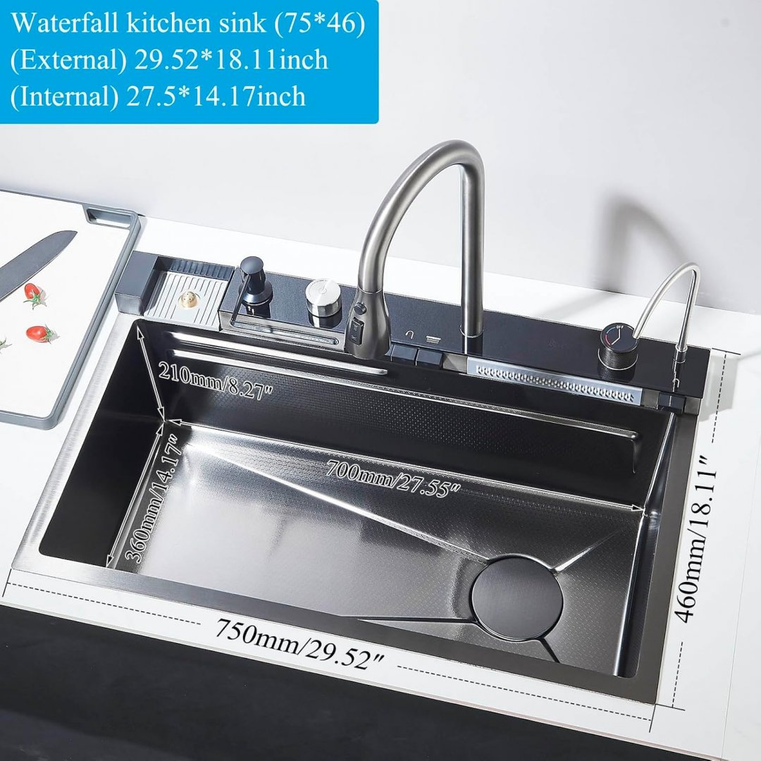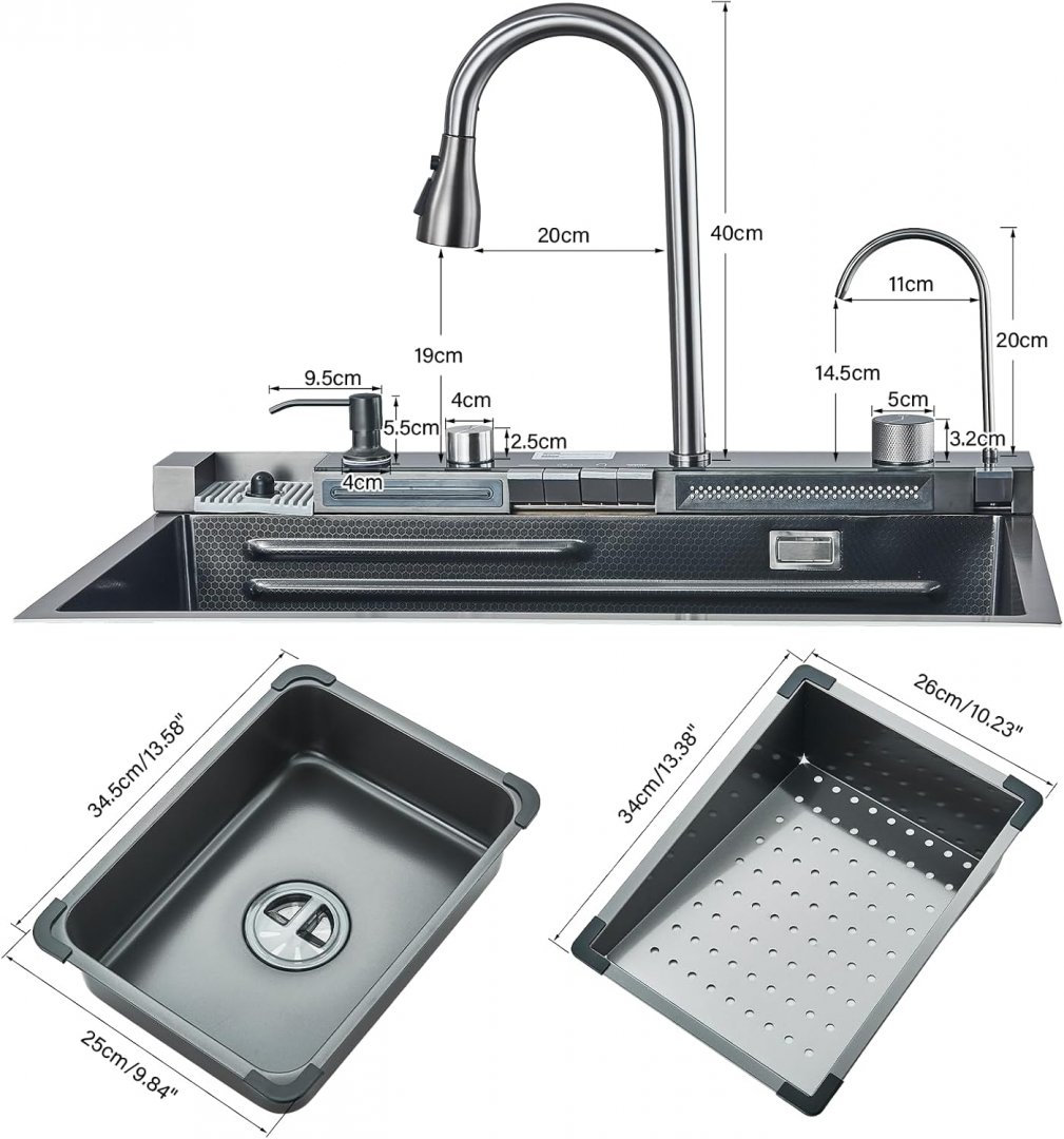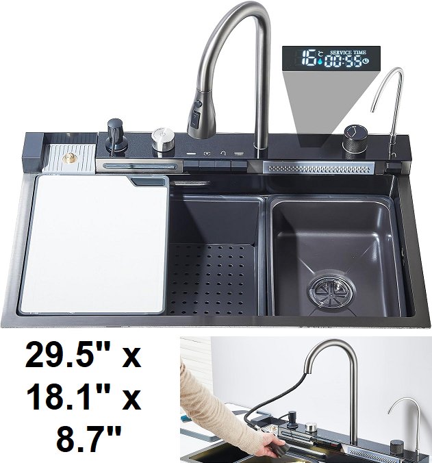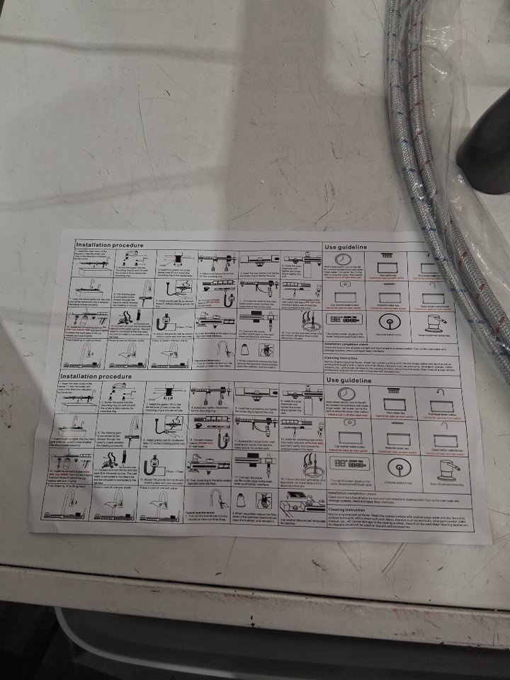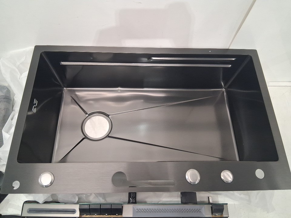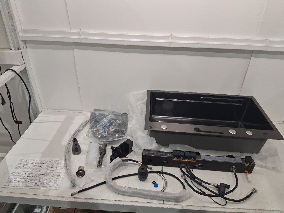 Please note the sink has a dent in bottom of it and is missing the triangular draining basket, moveable basin, and cutting board (see photos)