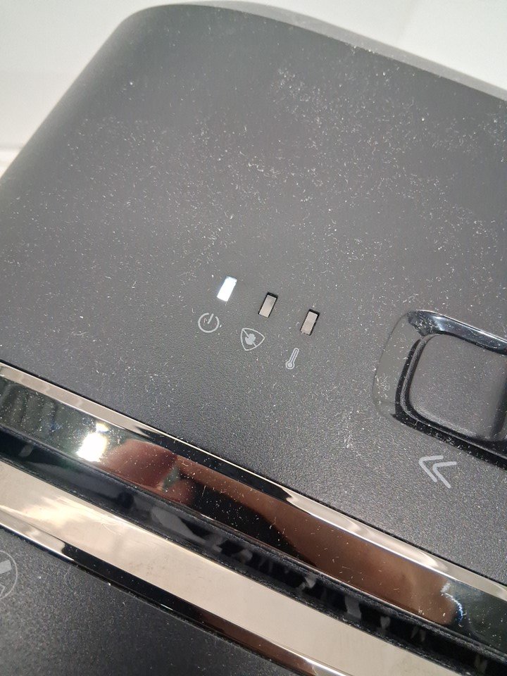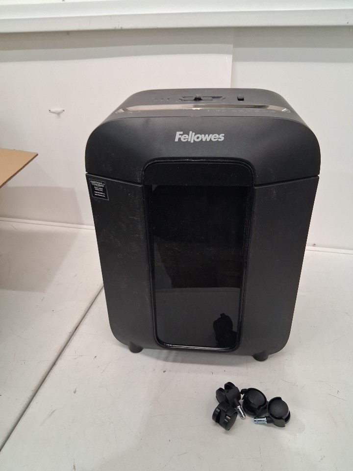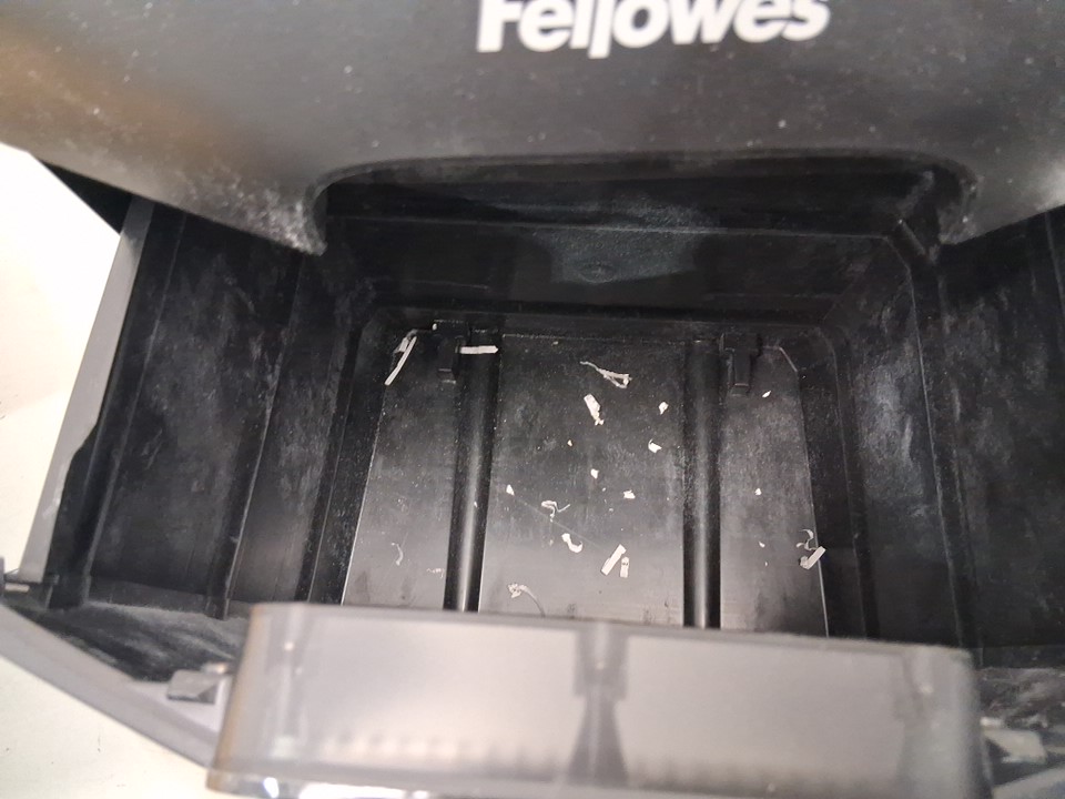 Shredder has paper in it, and paper dust on it. Has been tested for power and functionality
