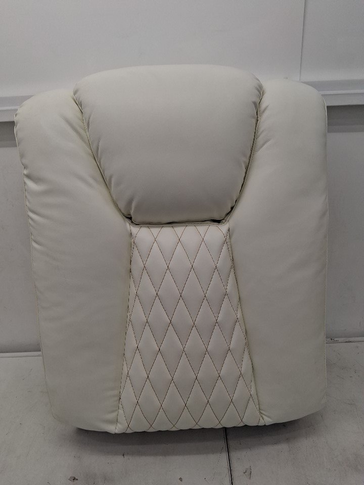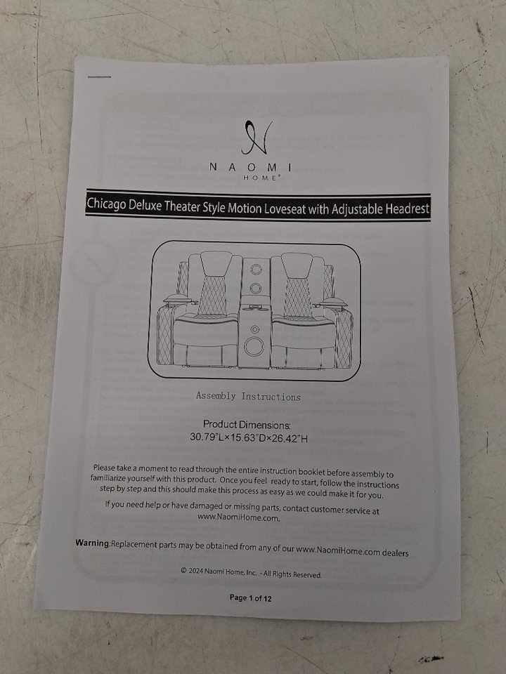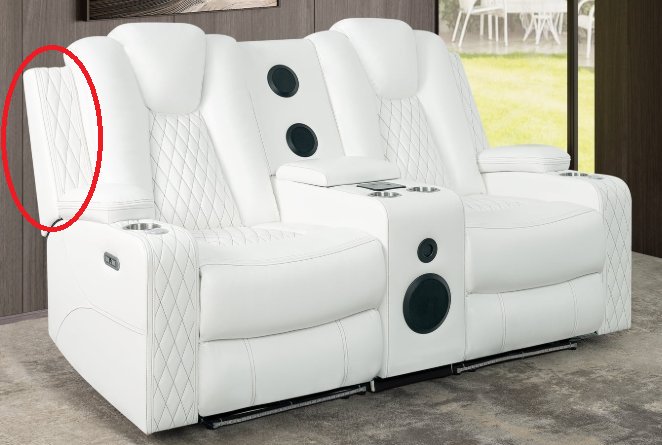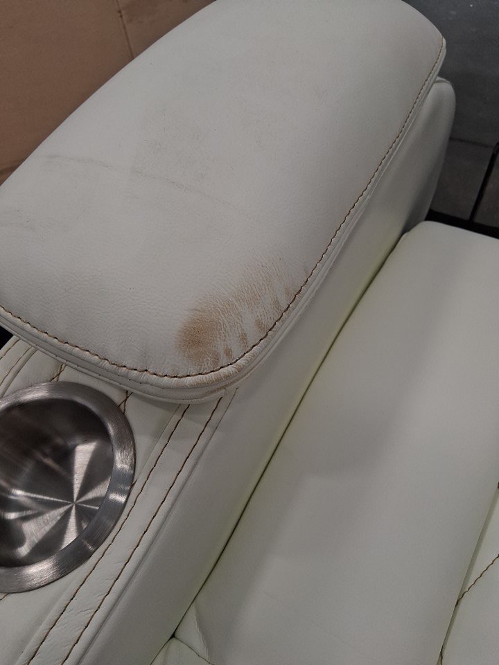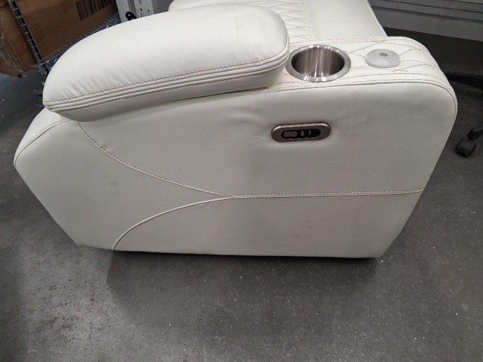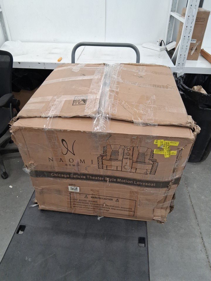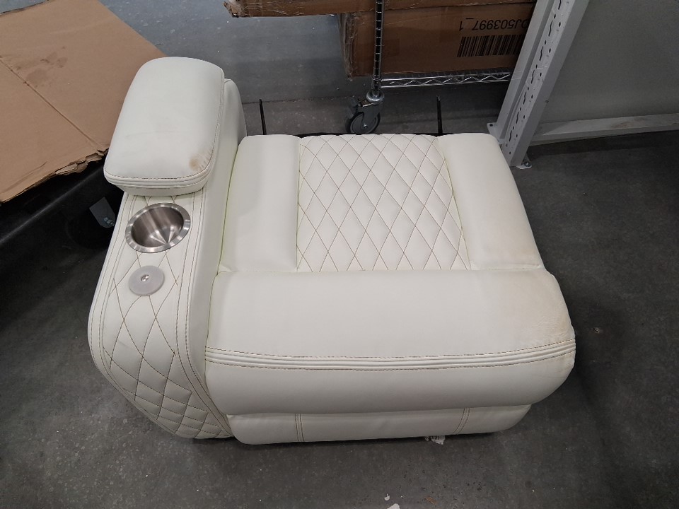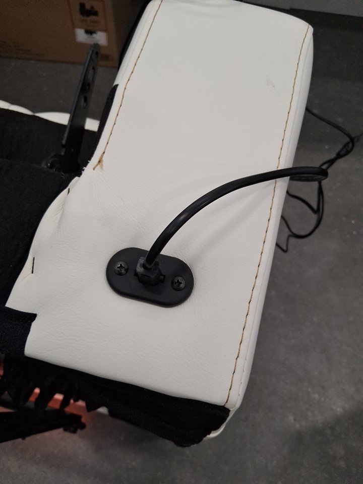 The left arm support is missing from the box (see third image), and one of the hinges on the armrest is unscrewed, though the screws are inside the armrest storage compartment. Additionally, there are some noticeable stains on both the armrest and the right side of the seat, indicating some previous use or rough handling - see photos. Other than these issues, there appear to be no functional problems or damage to the seat, and the motion and lights appear to function normally when plugged in.
