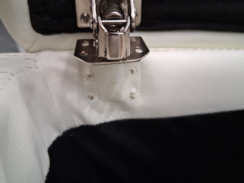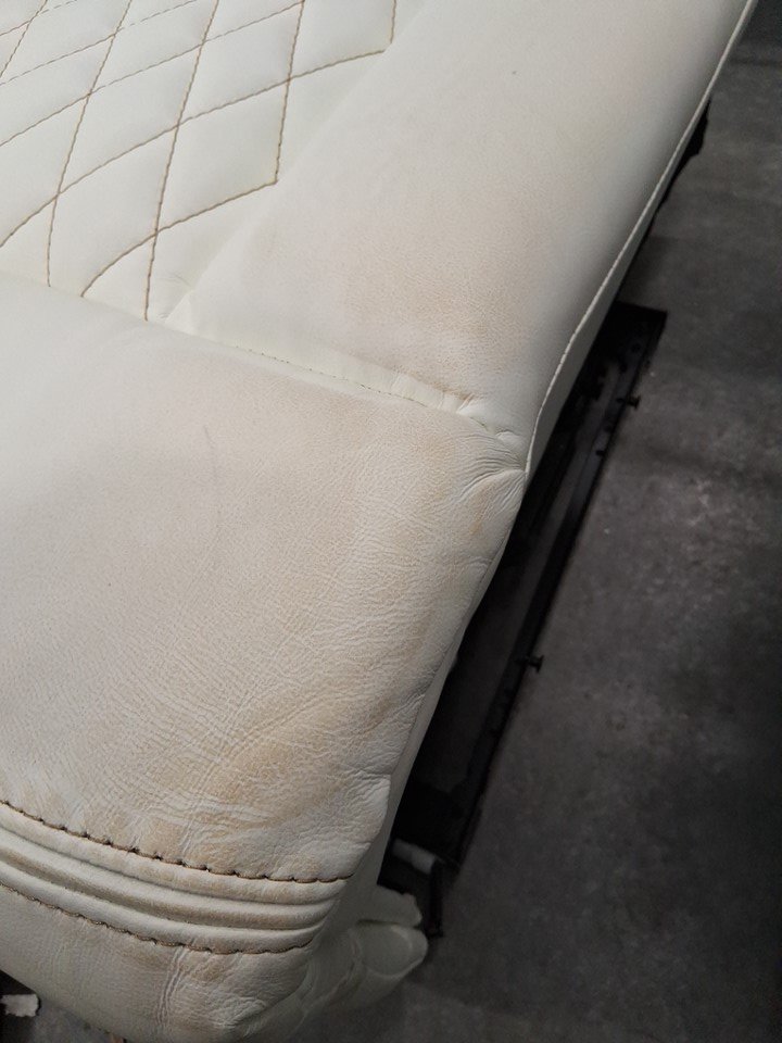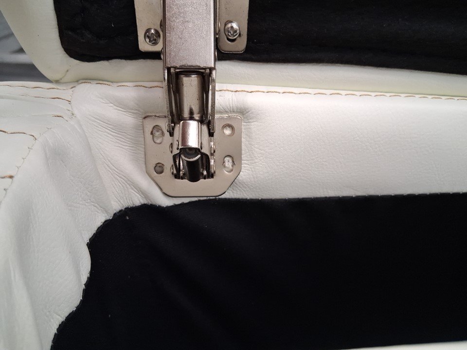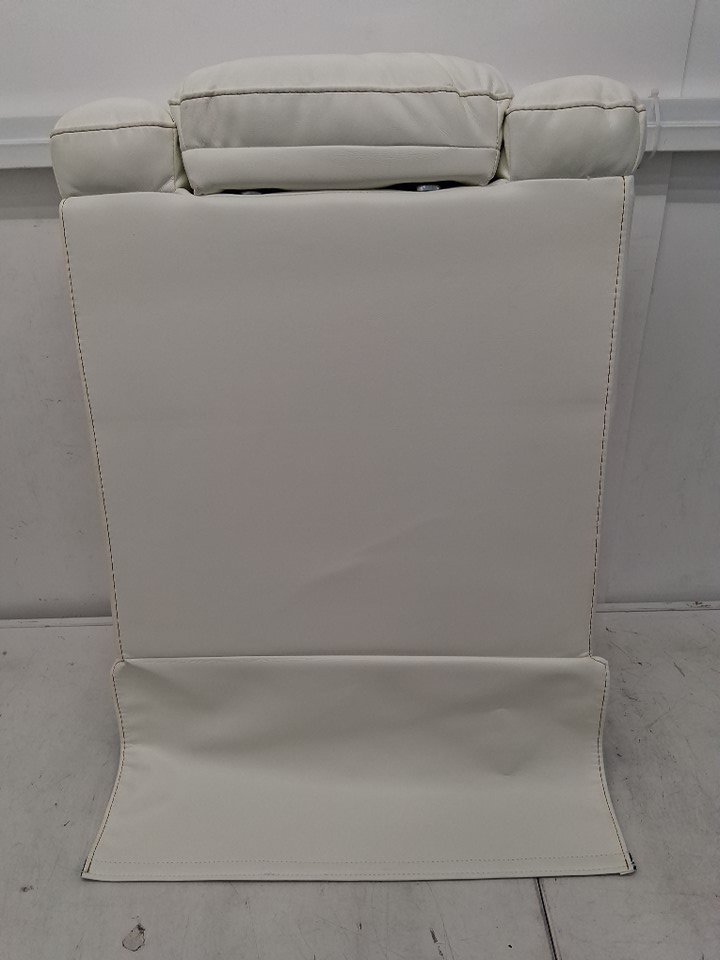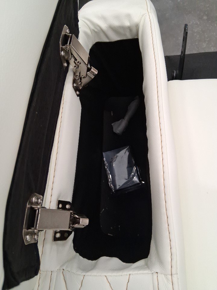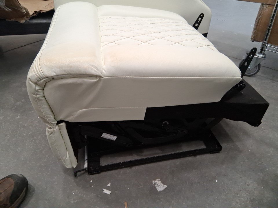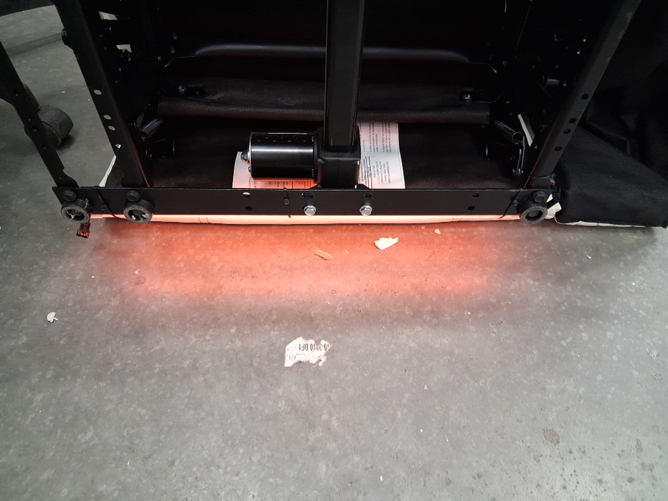 The left arm support is missing from the box (see third image), and one of the hinges on the armrest is unscrewed, though the screws are inside the armrest storage compartment. Additionally, there are some noticeable stains on both the armrest and the right side of the seat, indicating some previous use or rough handling - see photos. Other than these issues, there appear to be no functional problems or damage to the seat, and the motion and lights appear to function normally when plugged in.