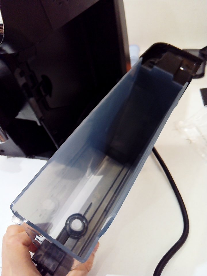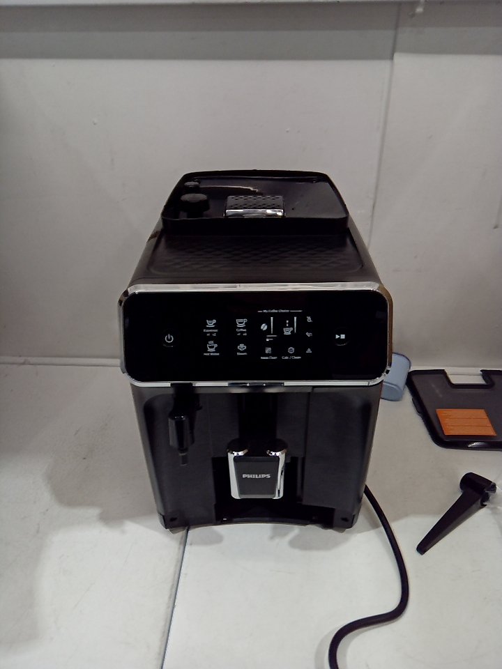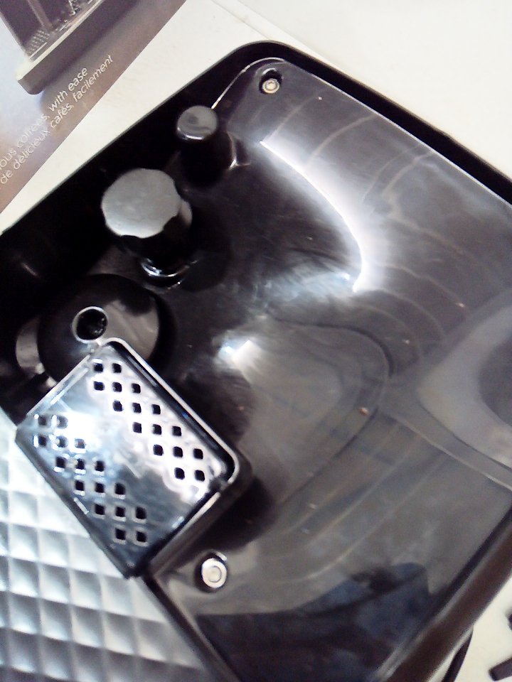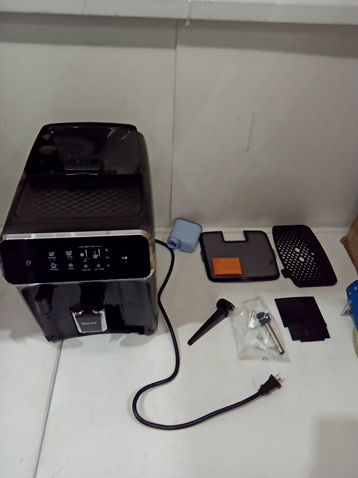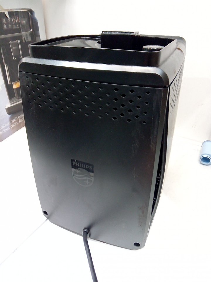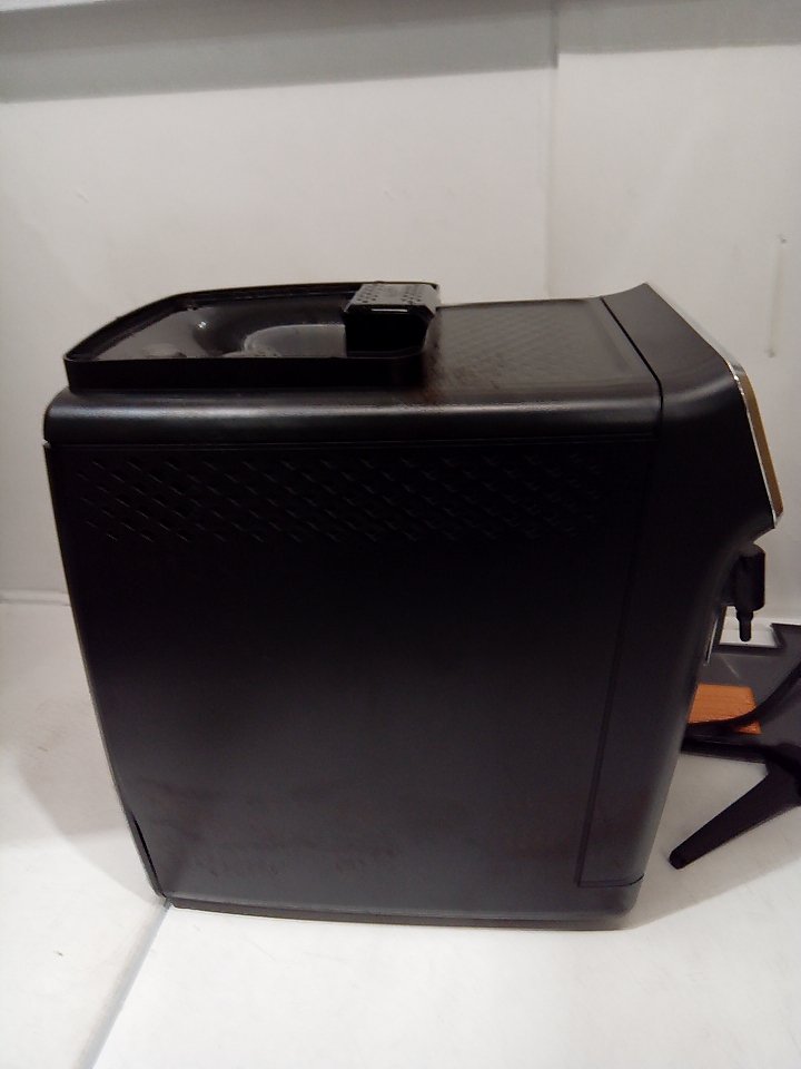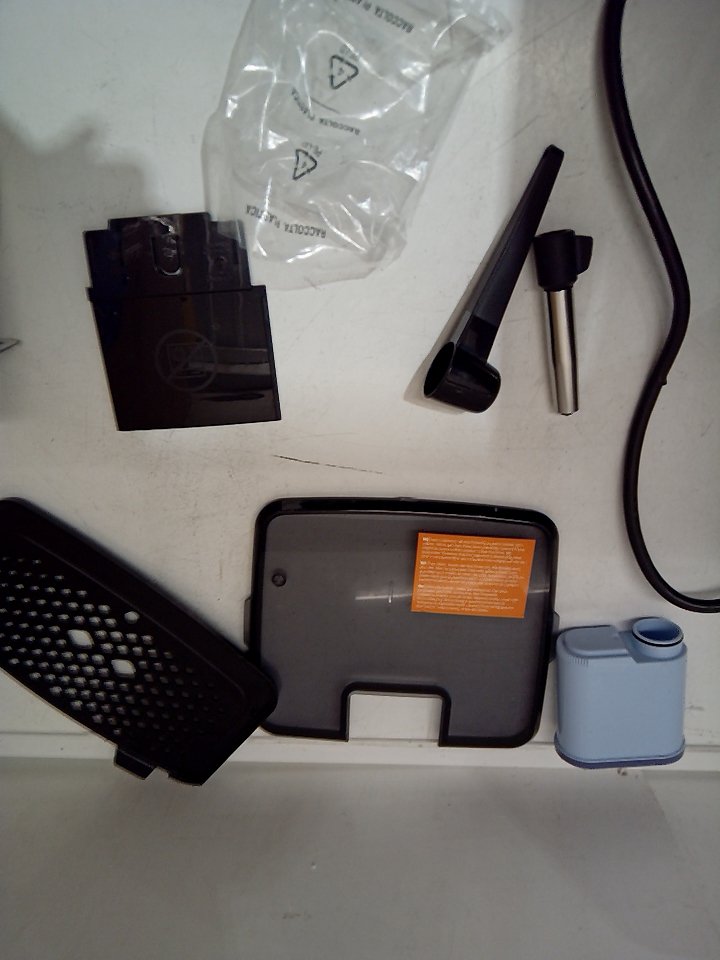 There are scratches and ground coffee residue in/on the machine. The panel on the left side is not sitting flush on the back of the unit, it is slightly warped /there is a gap. Ours is missing the bottom tray piece, small plastic flap piece for the top and the cleaning accessories. Please note that this machine cannot function without the bottom tray inserted. In order to use this machine, you will need to purchase a compatible tray for the bottom separately. Tested for power. (SEE PHOTOS)