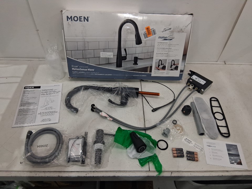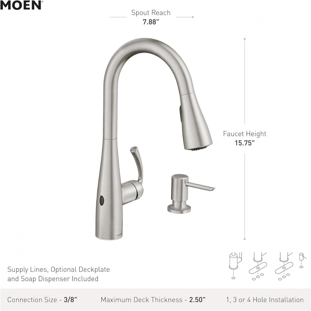 moen essie motionsense wave One-Handle High Arc Kitchen Faucet with soap dispenser and touchless activation - 15.75" x 7.9" - matte black (model: 87014EWBL)