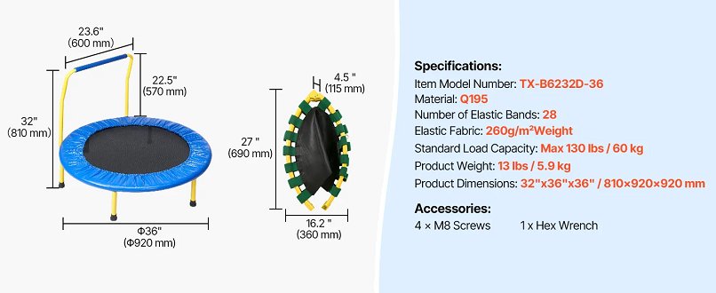vevor indoor/outdoor mini trampoline with foam handle for kids - 3ft - blue/yellow (model: tx-b6232d-36)