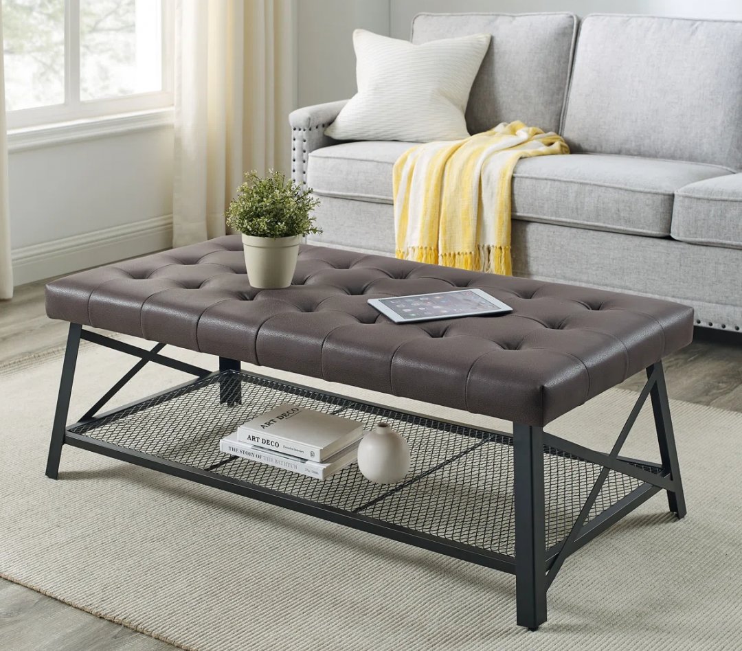 Mercury Row Sepviva Floor-Shelf Coffee Table with Storage with Metal Frame, Open Mesh Floor Shelf and Hidden Drawn-Out Storage Compartment - Dark Brown (Model: D1606)