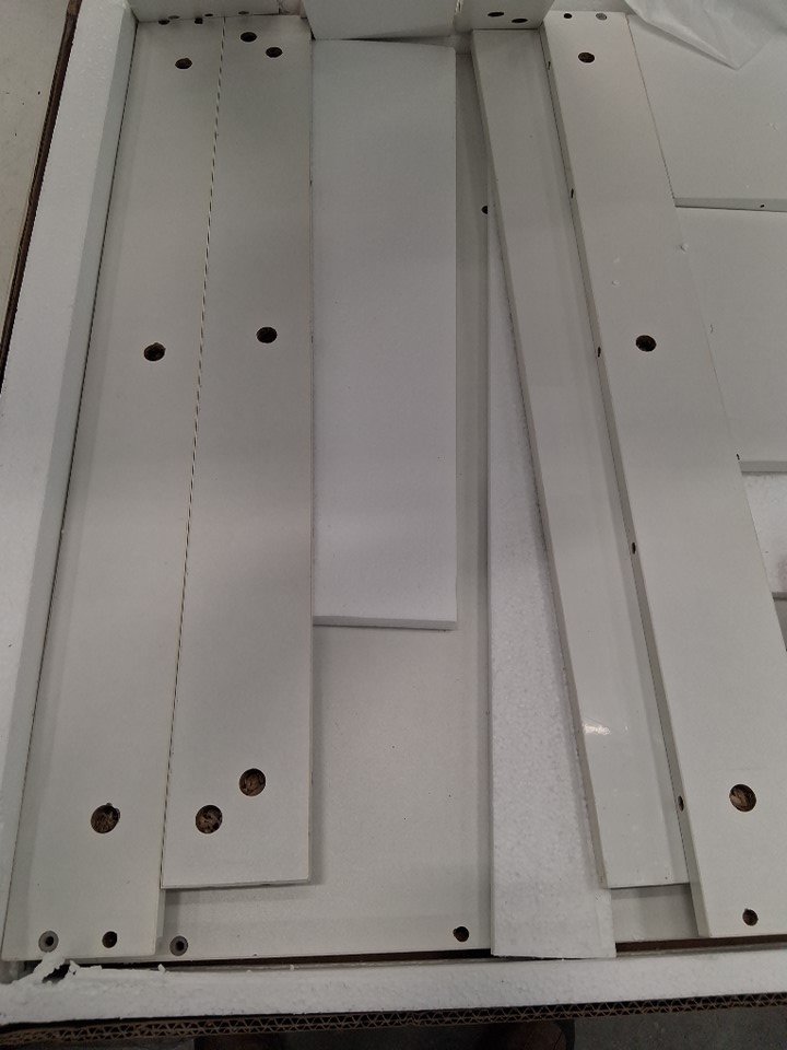 There are small scuffs and some dirt stains on a variety of pieces, as well as a thin crack in the surface of one of the tabletop supports, indicating at least some previous rough handling if not ownership and use, but aside from these cosmetic issues all parts appear present and in good condition - see photos.