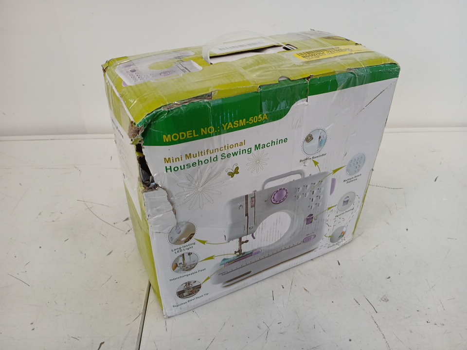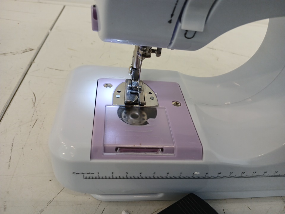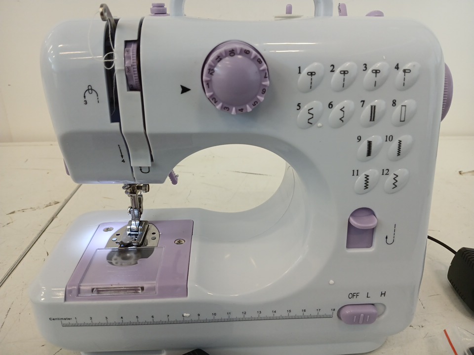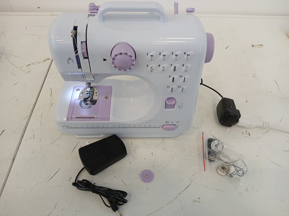 the sewing machine has been tested for power and has thread going through it indicating some light use.