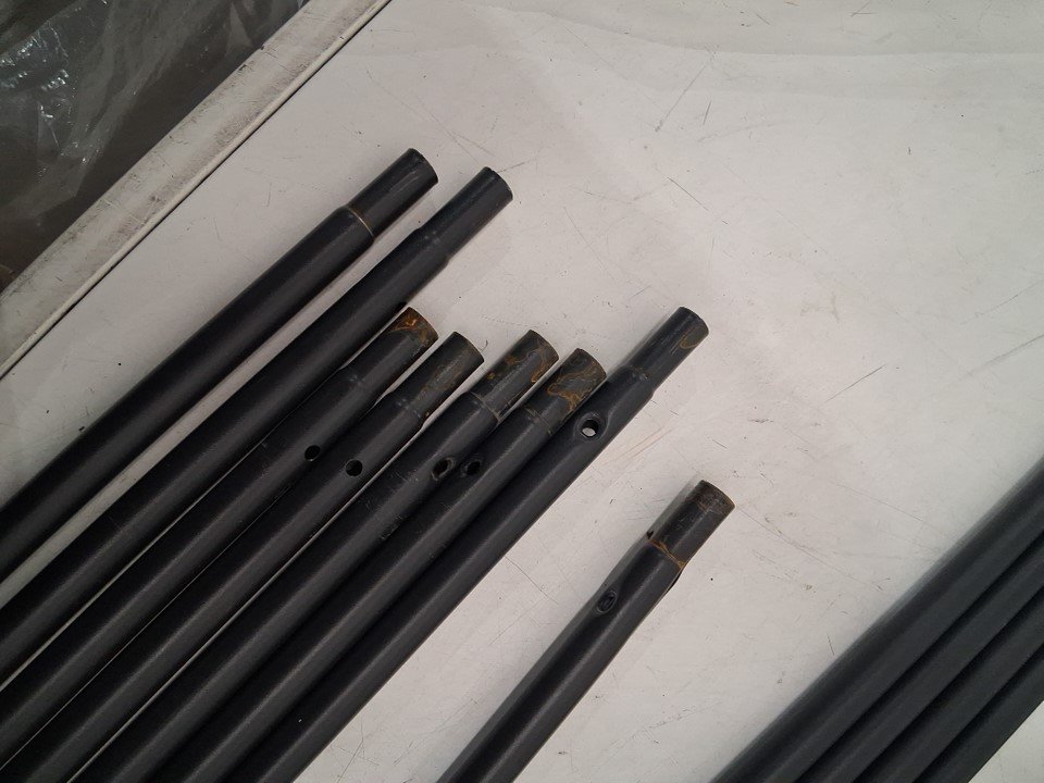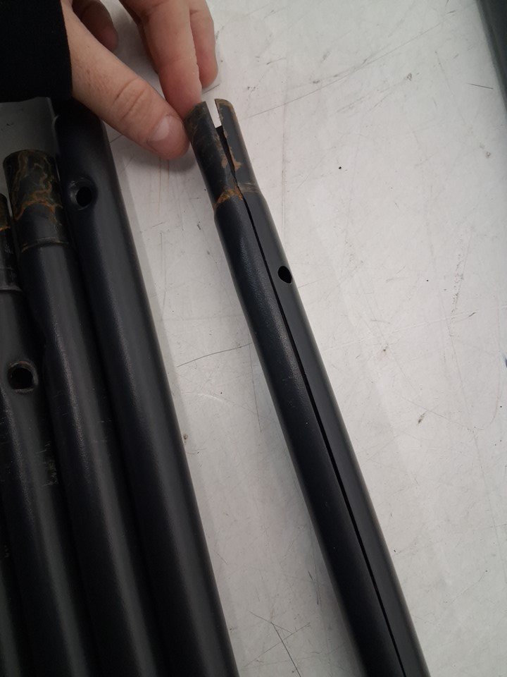 Partition wall poles have scratches and rust discoloration on them, one of the poles is starting to split