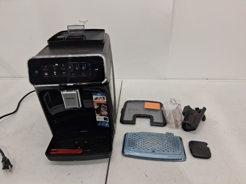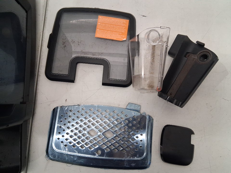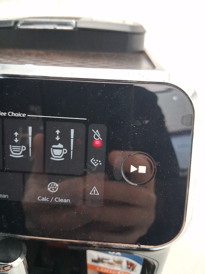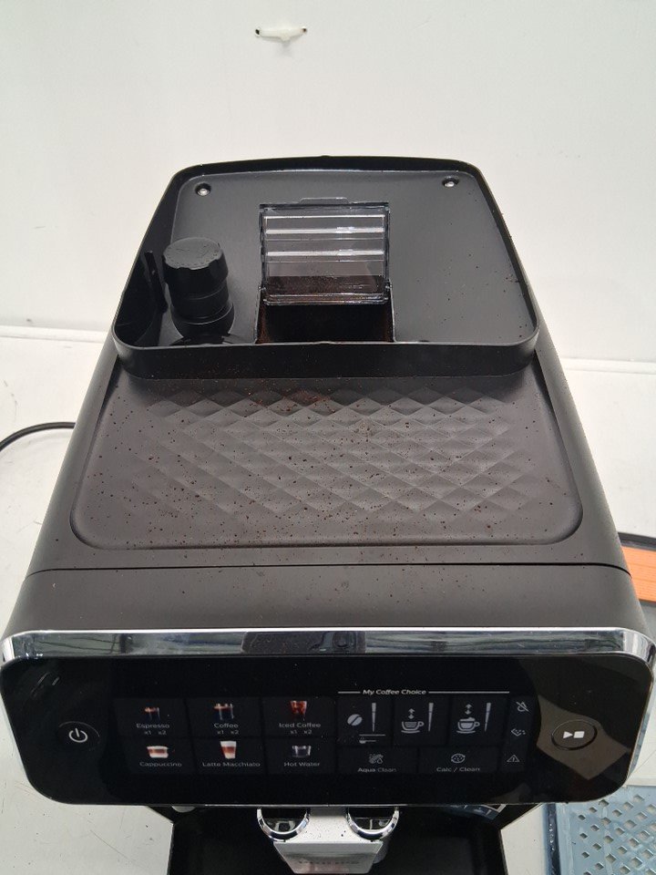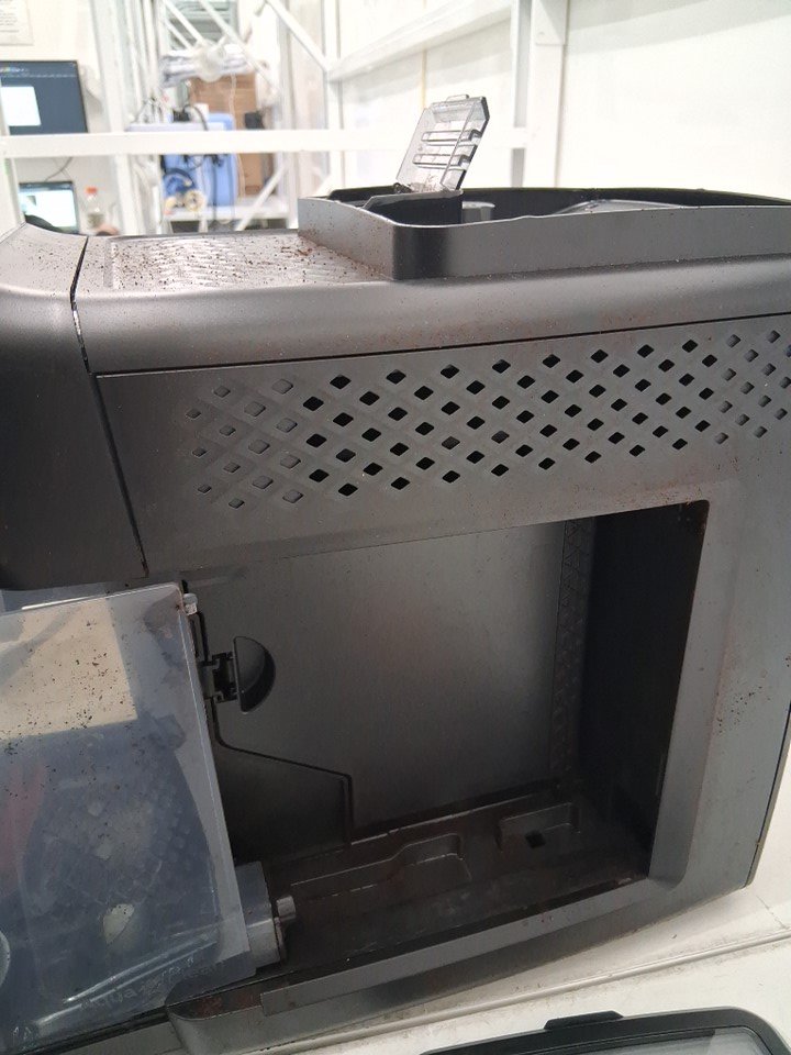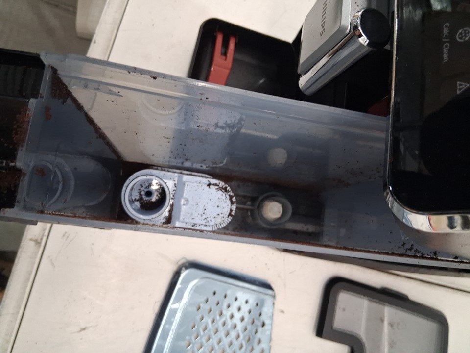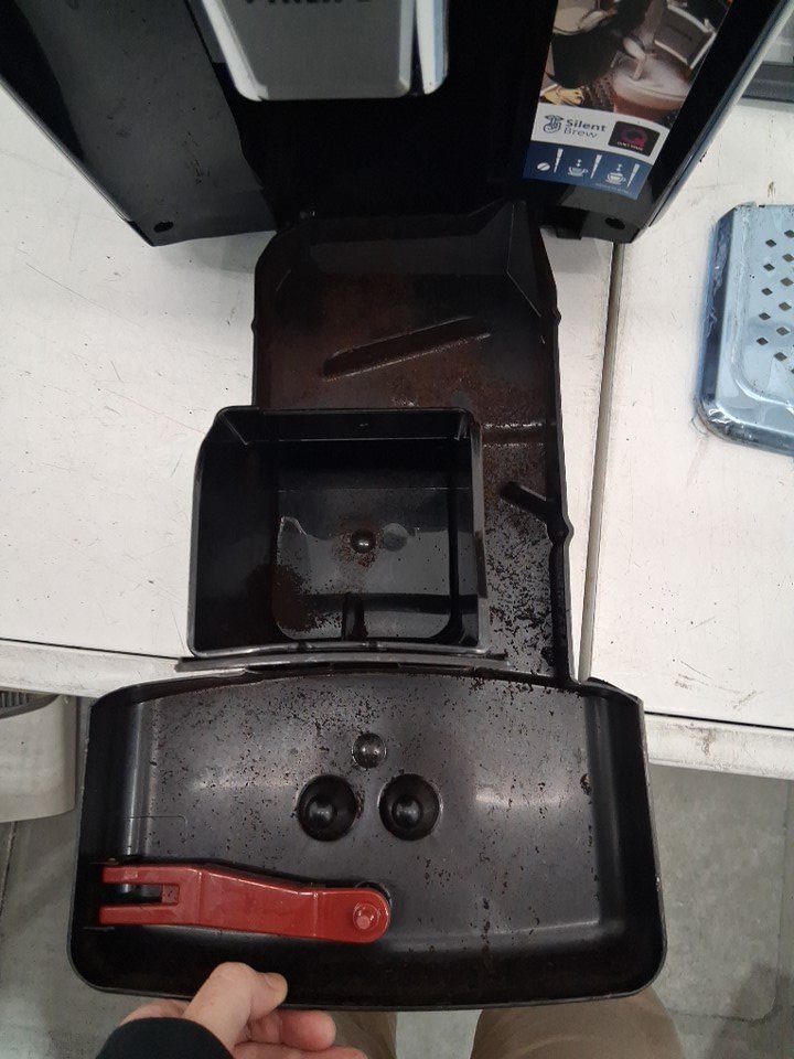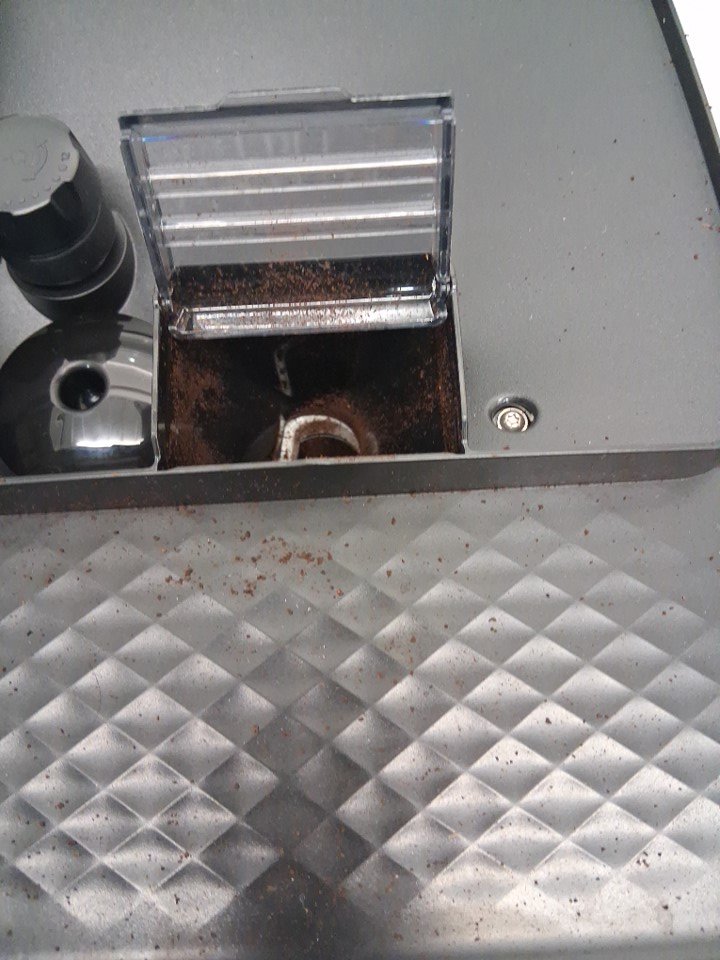 espresso machine has coffee grinds inside and on it.
