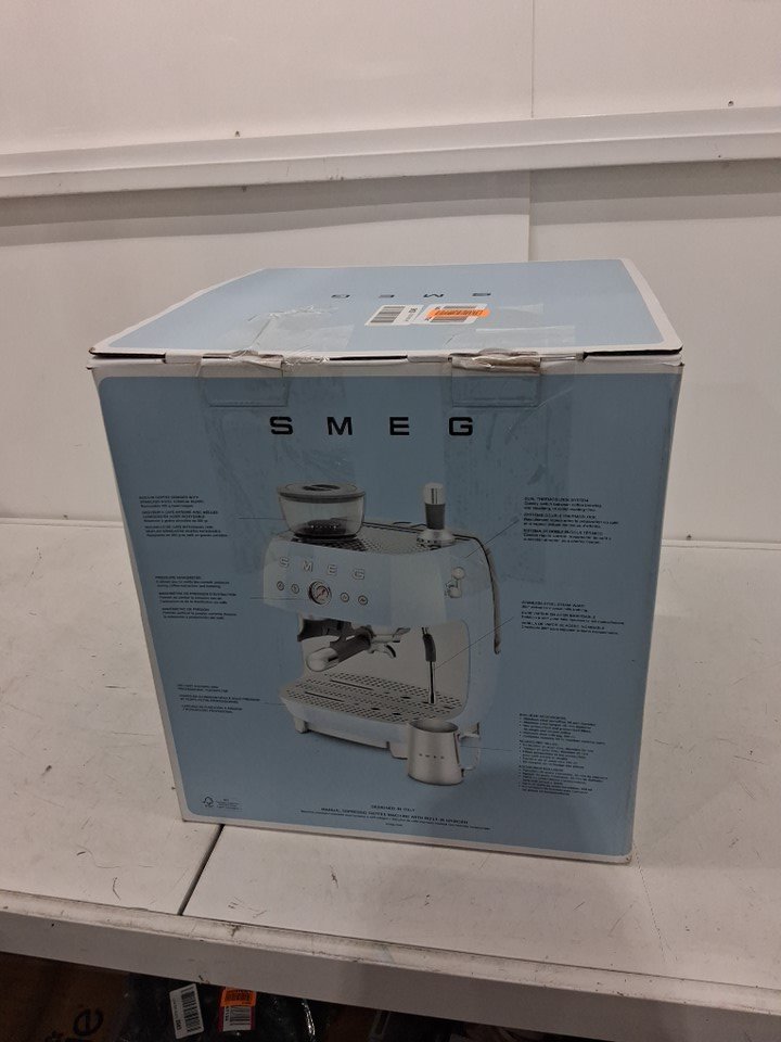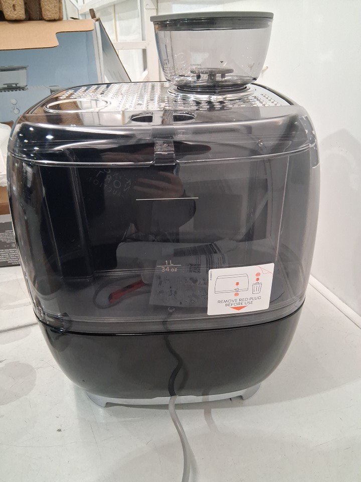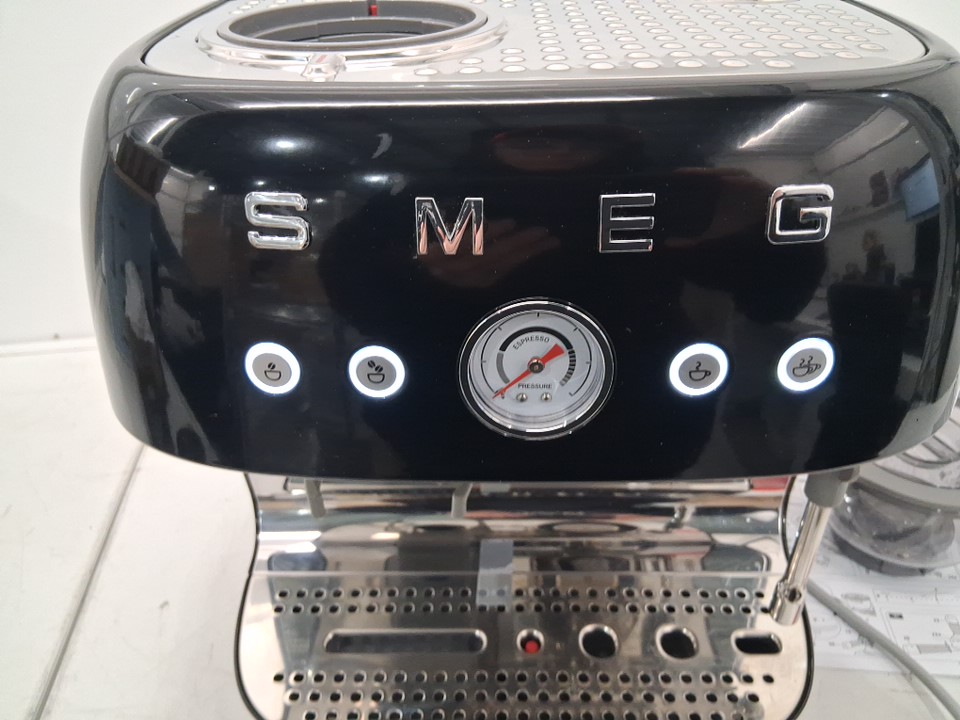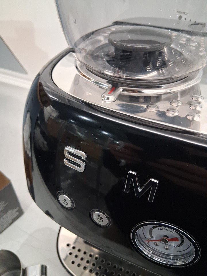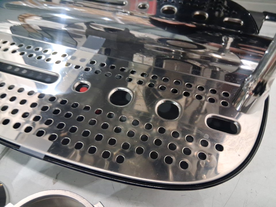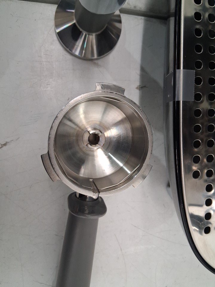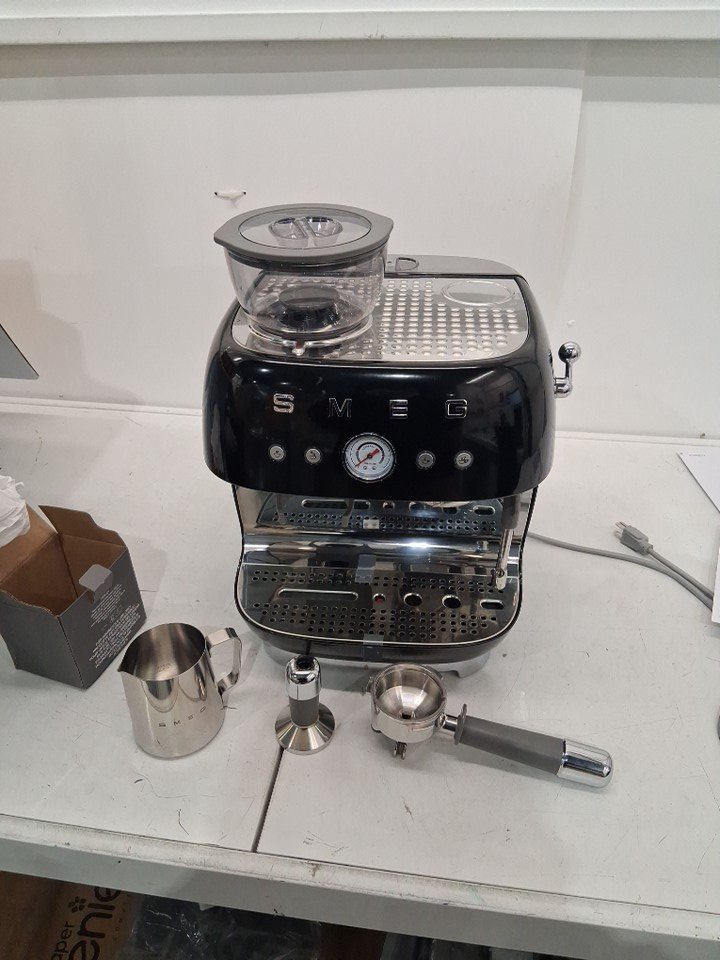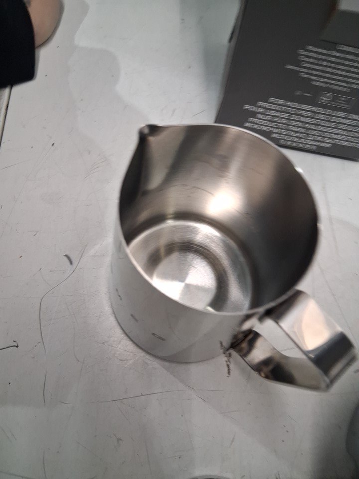 Coffee machine has Scuff marks and scratches on it. milk frother cup has water spots. Tamper is missing inserts for it