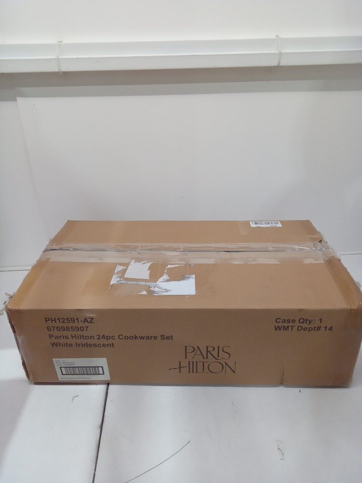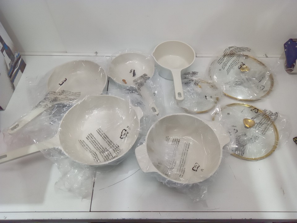 box states 24pc but only 8 present, missing all pot holders. pots, pans and lids don't appear used.