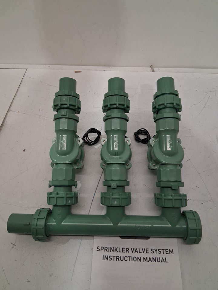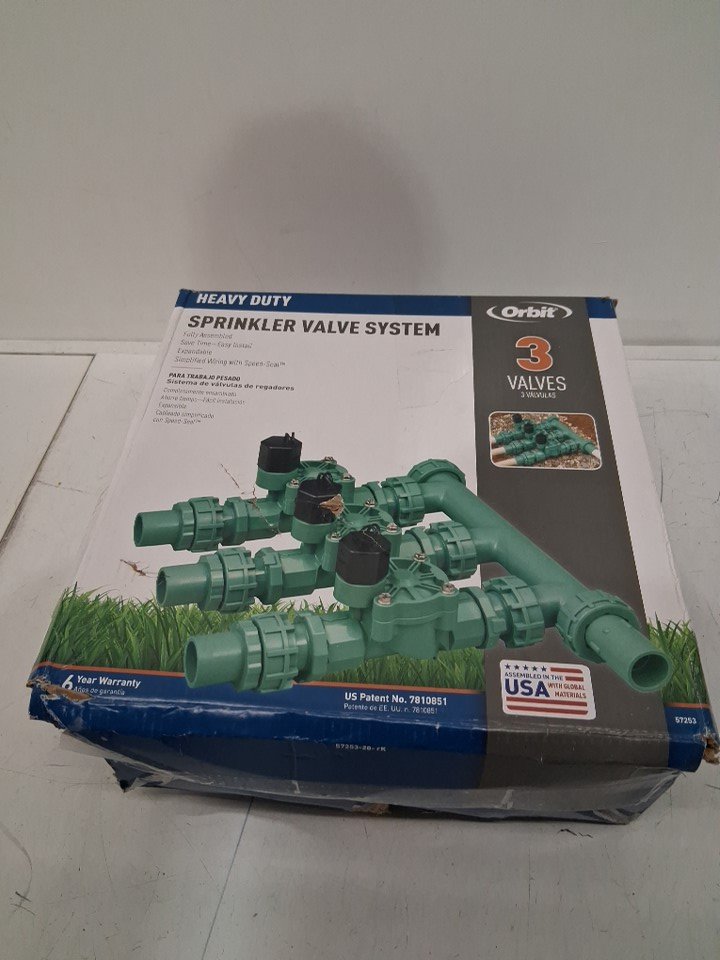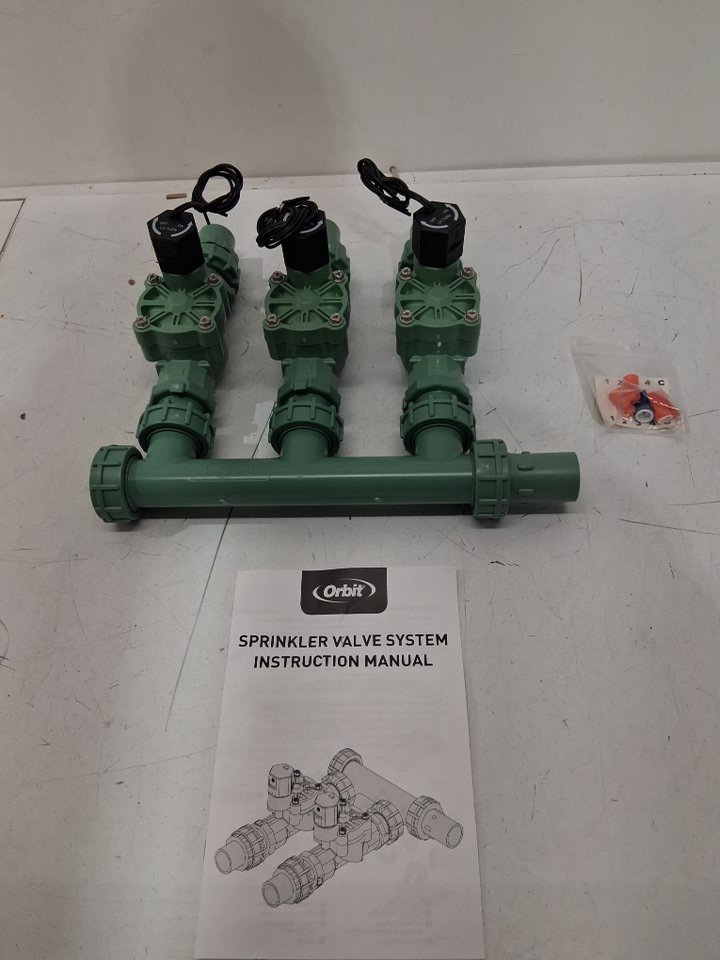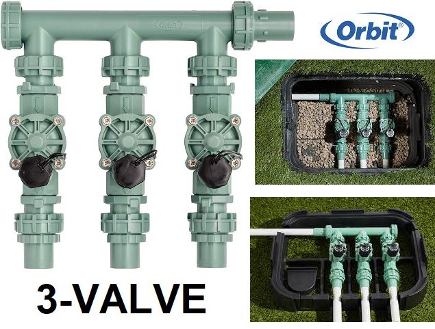 ORBIT 3-VALVE HEAVY DUTY PREASSEMBLED SPRINKLER MANIFOLD, 12" x 13" x 5" - GREEN (MODEL: 57253)