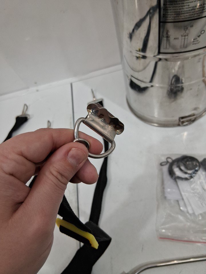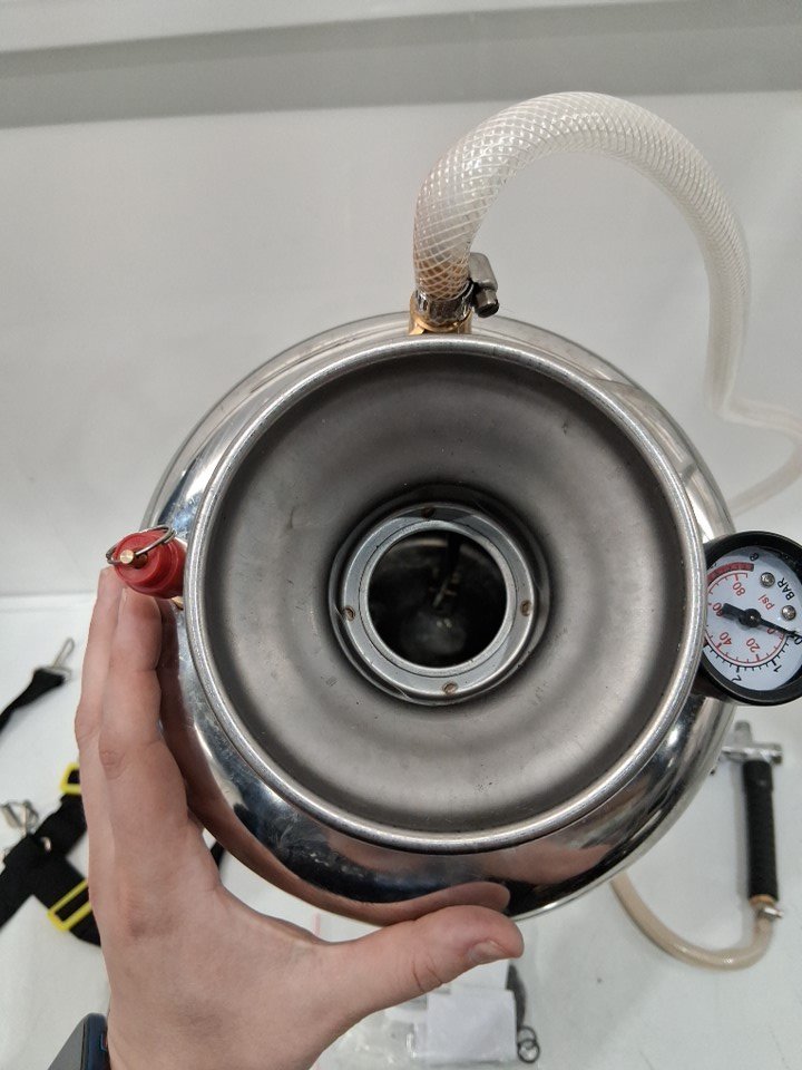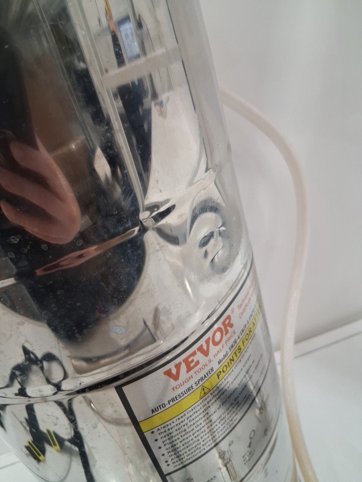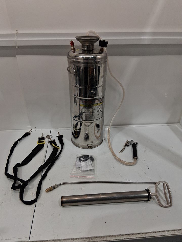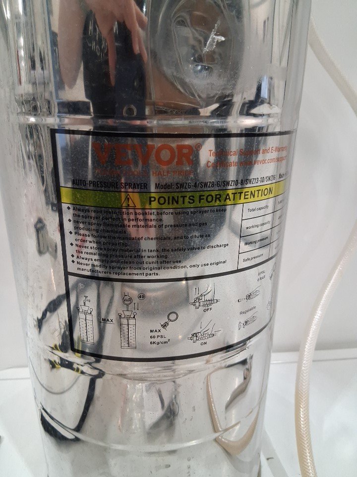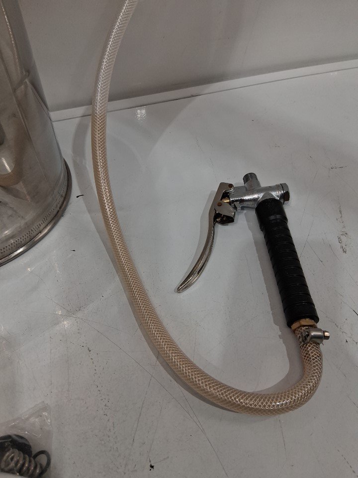 Item shows signs of previous use such as fluid marks inside container and hose. Item has small dent on side of canister. Item has a loose handle ring, no longer attached to container.