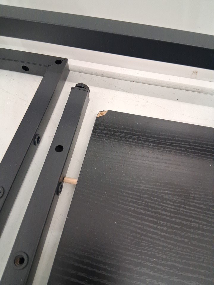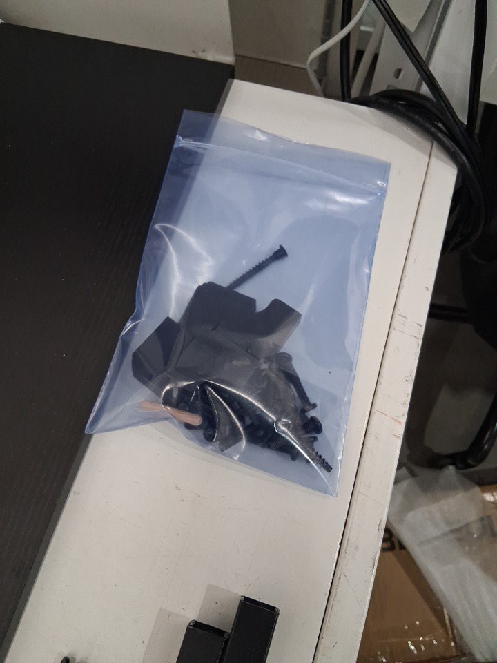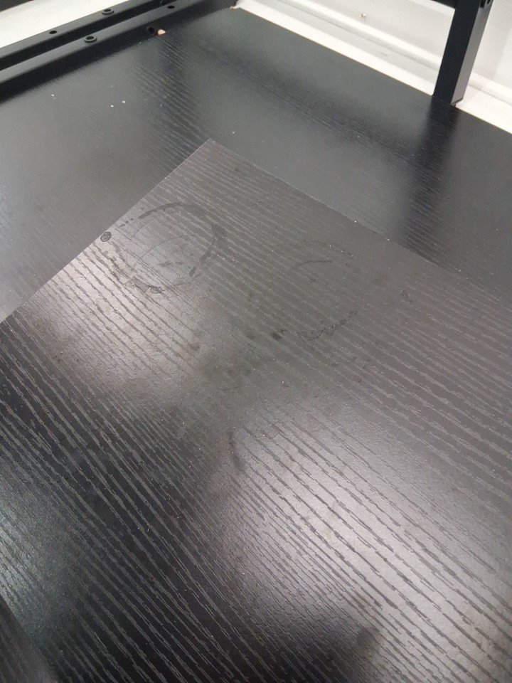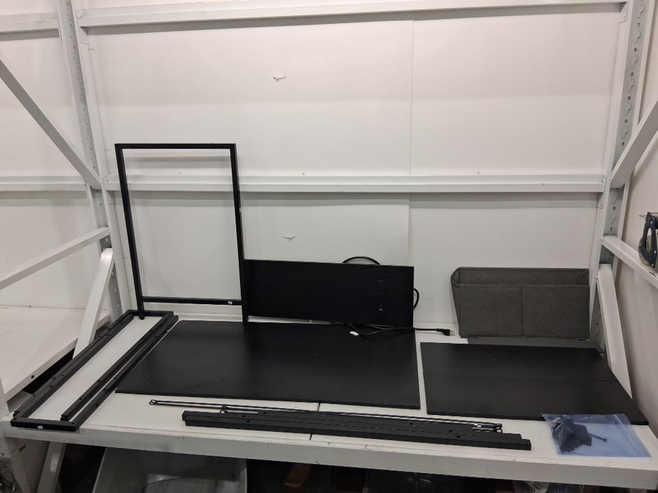 Desk has been previously assembled, hardware was loose in box, some wooden pegs are in desk. Charging station is installed . Desk has water marks and smudges on surface
