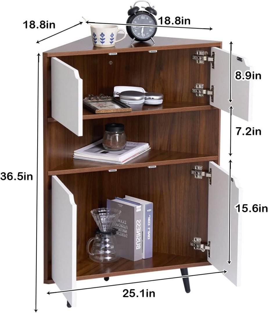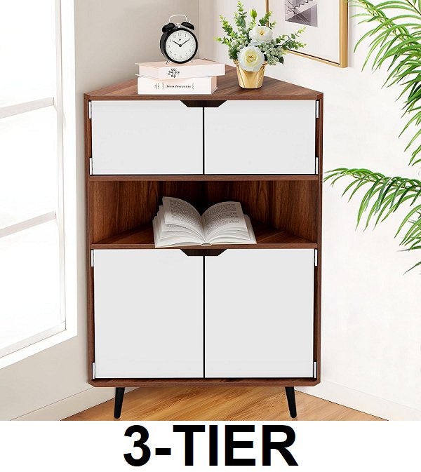 sogesfurniture Corner Storage Cabinet with Doors and Shelves - 3-Tier - White / Teak (MODEL: 10CZSSLR03TK)
