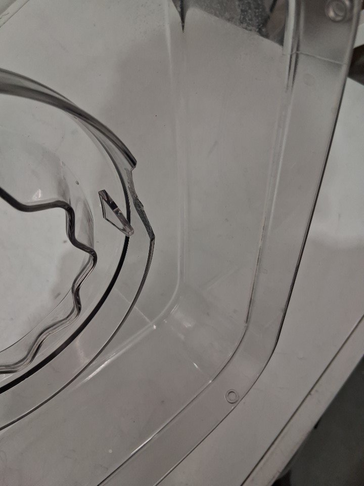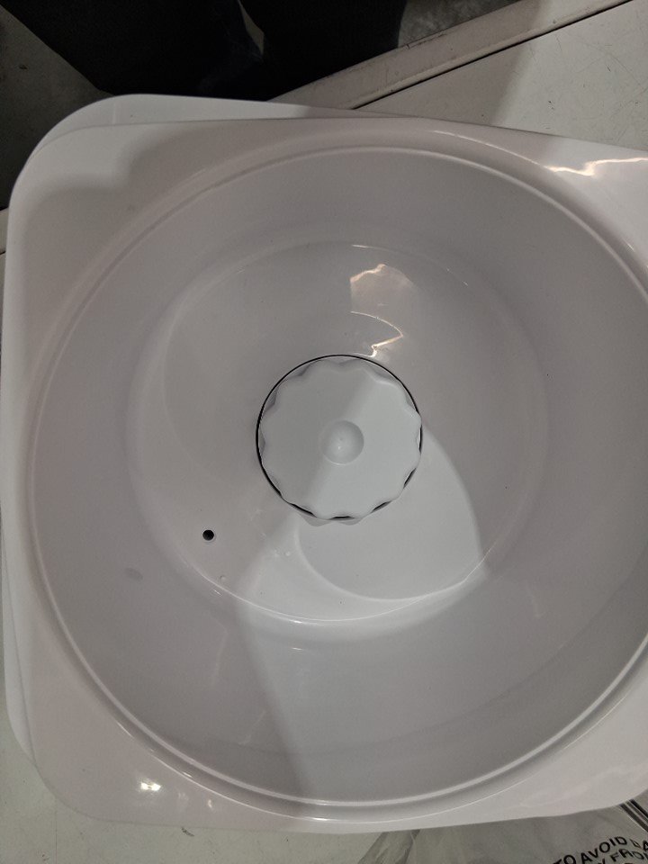 please note there is a chunk of plastic broken off the lid, does not affect use. there are also water marks on lid indicating previous use. tested for power. see photos.