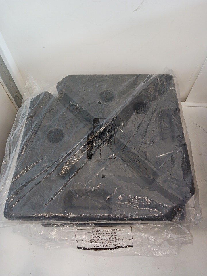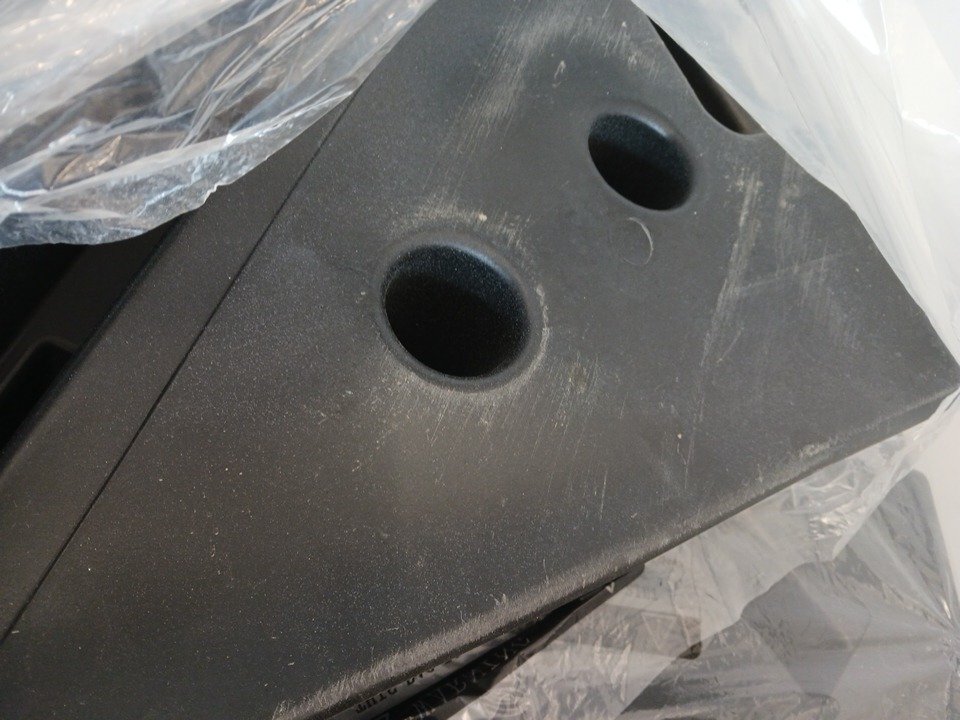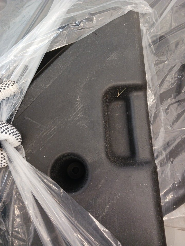 There are heavy scratches on the base consistent with prior use and movement. The surface shows visible scuffing and cosmetic wear but no structural cracks or breaks. All four base pieces remain fully functional and capable of securely holding an umbrella when filled.