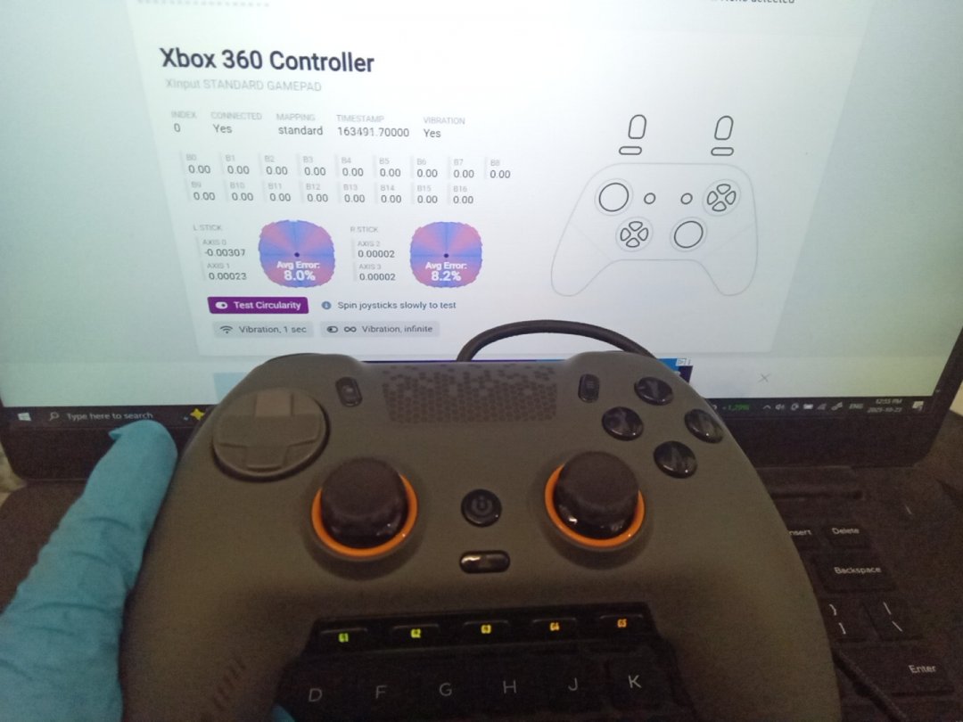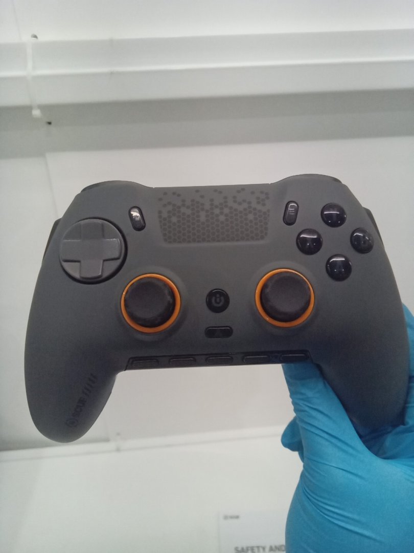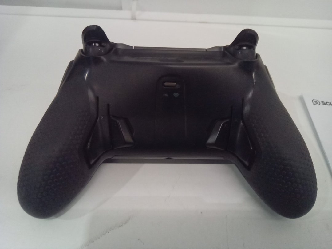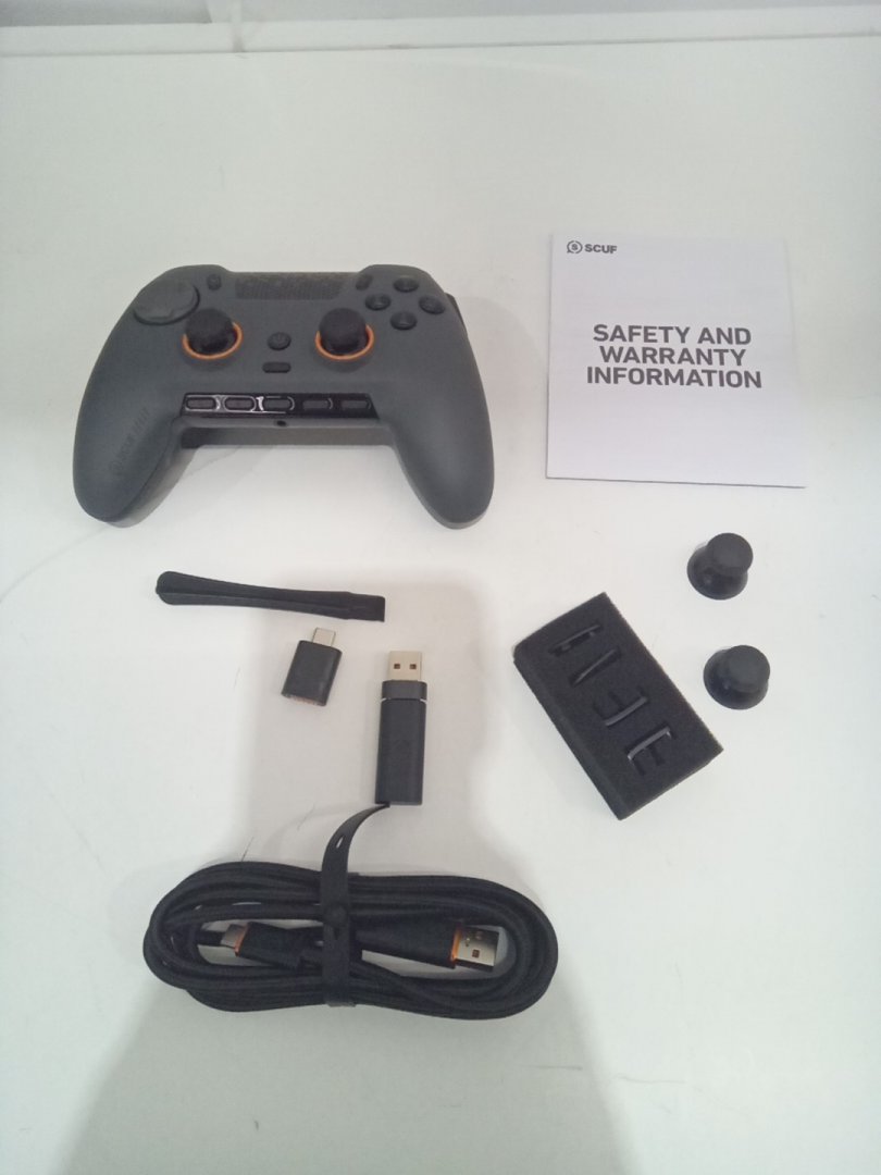 Dirt and dust in crevices and light scuffs on the darker parts from prior use. Upon testing, the controller did not want to pair with the receiver and may only function wired. Receiver is still included. iCUE and drivers required for configuration. Please see photos.