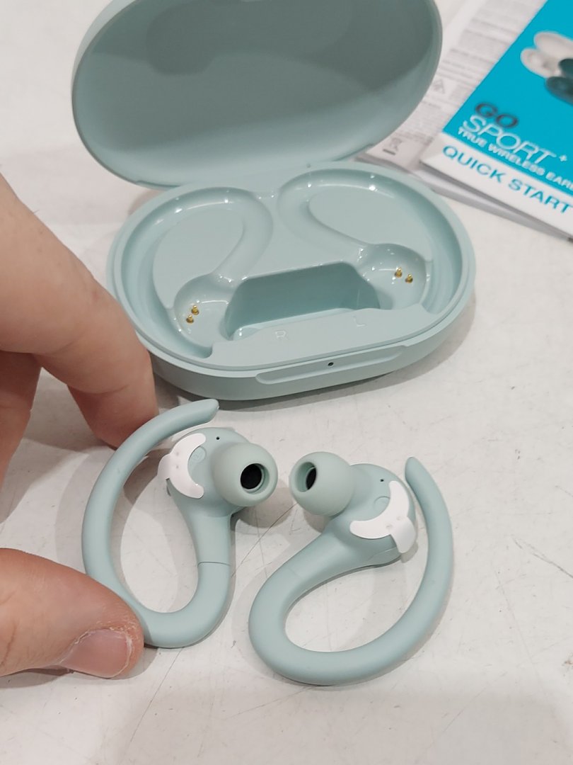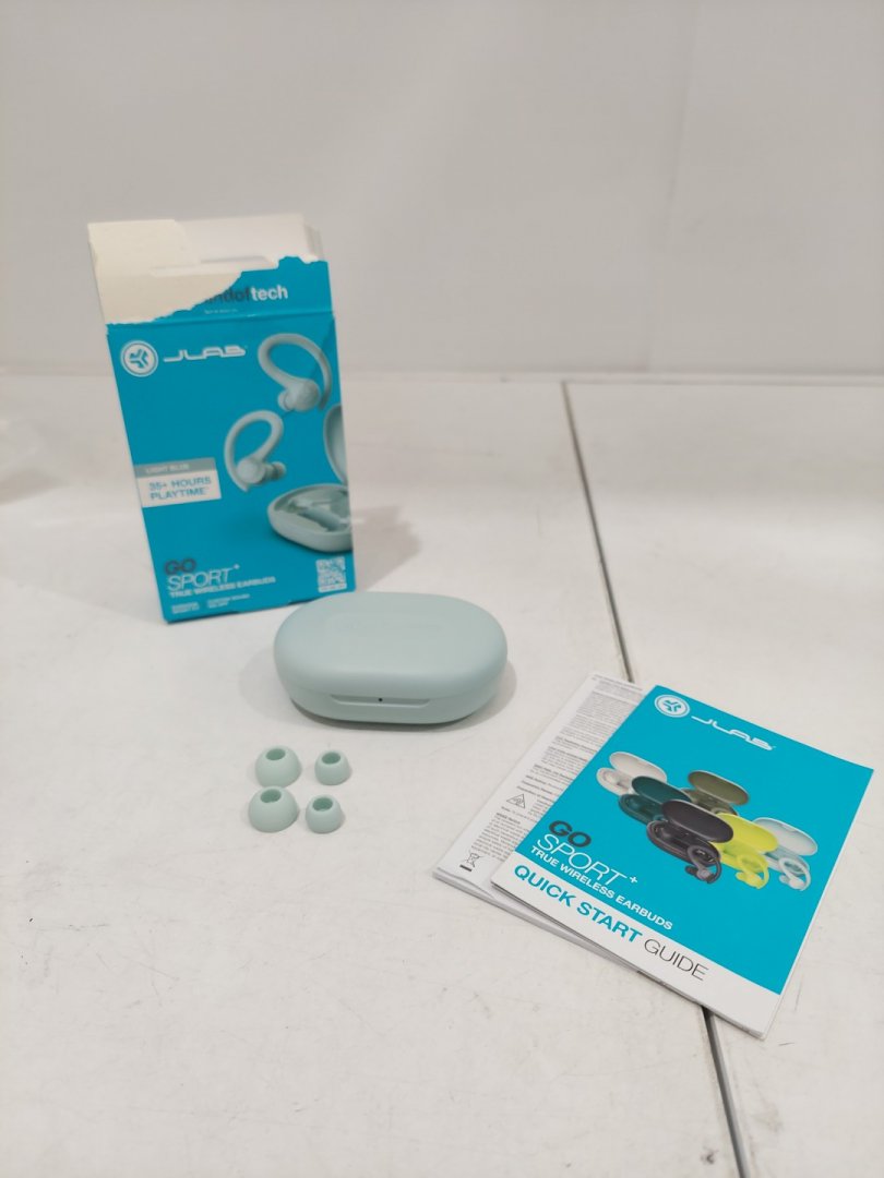 JLab Go Sport + Wireless Workout Earbuds with Secure Earhook Sport Design, 35+ Hour Bluetooth Playtime - light blue (Model:‎ go-sport+)