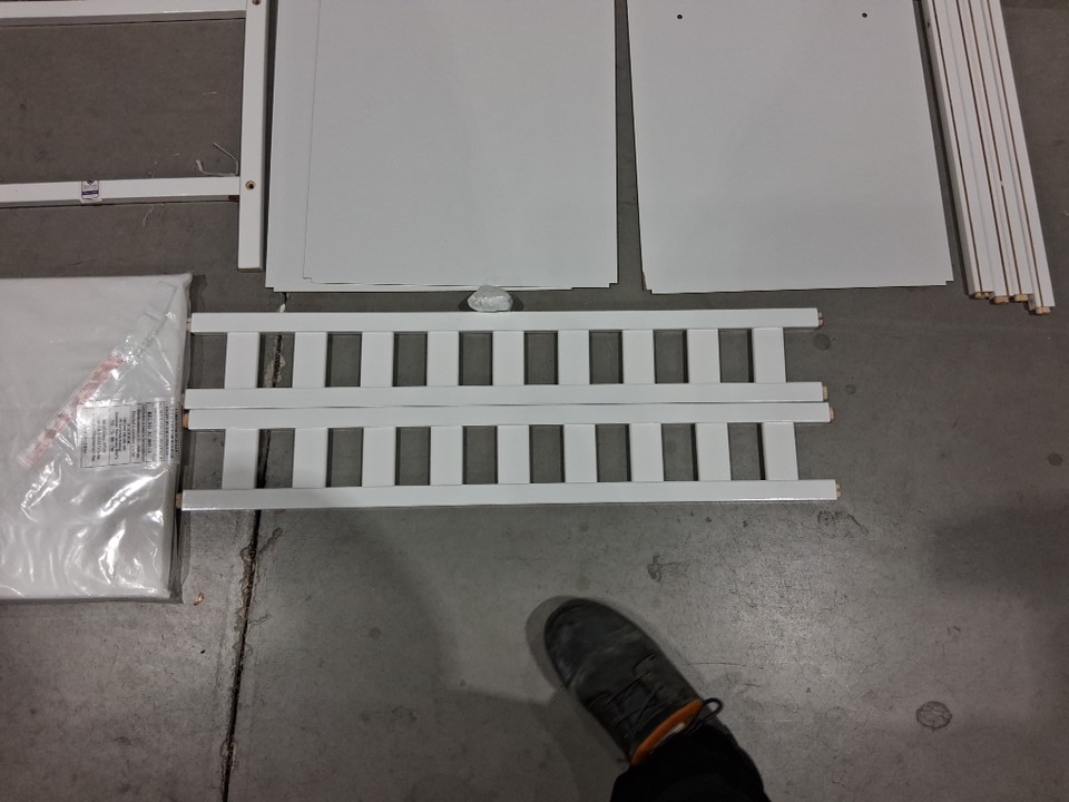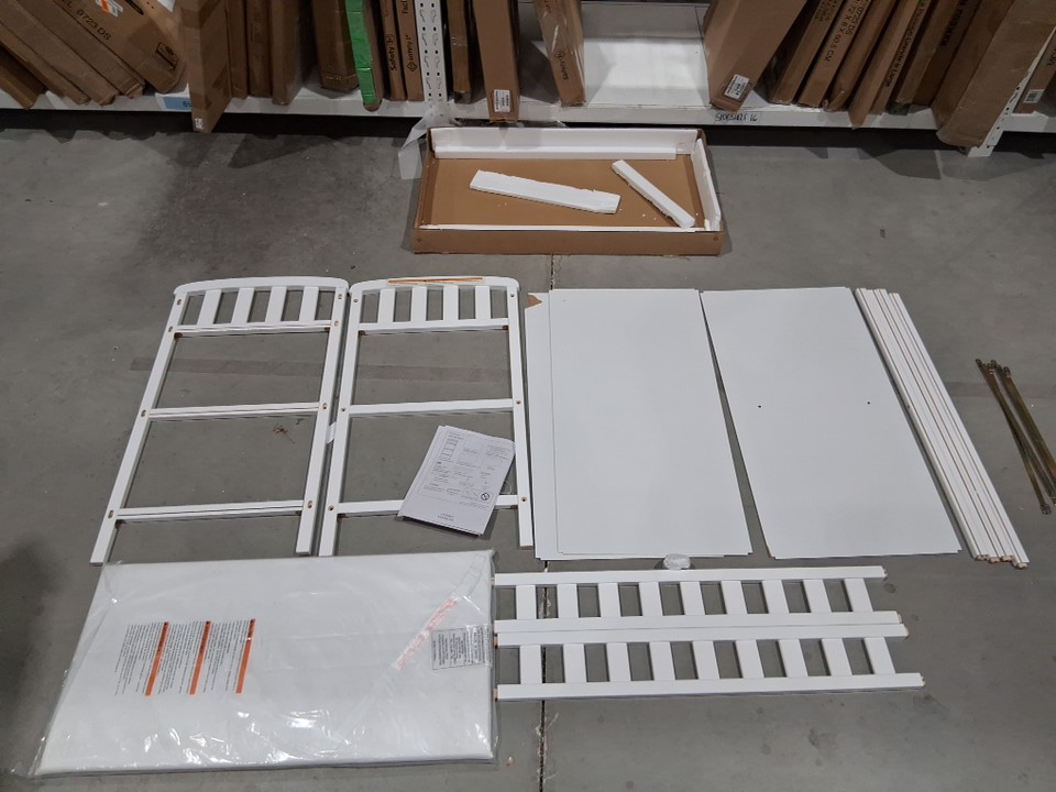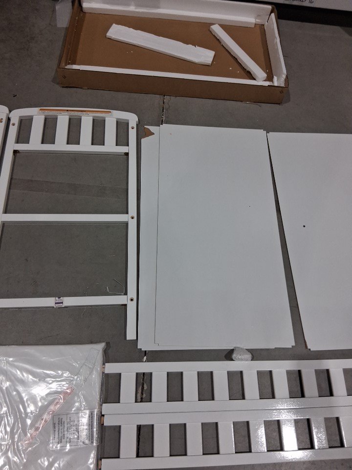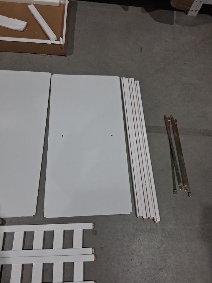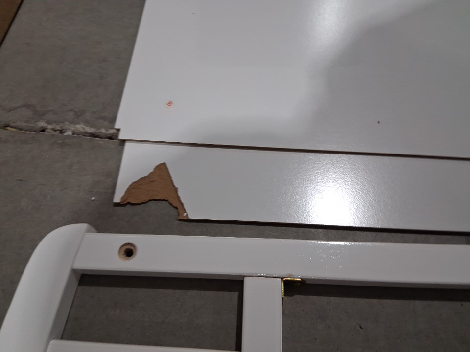 item has some chips missing out of the wood and scratch and scuff marks across the entire item. this indicates prior use / assembly hardware is missing for installation