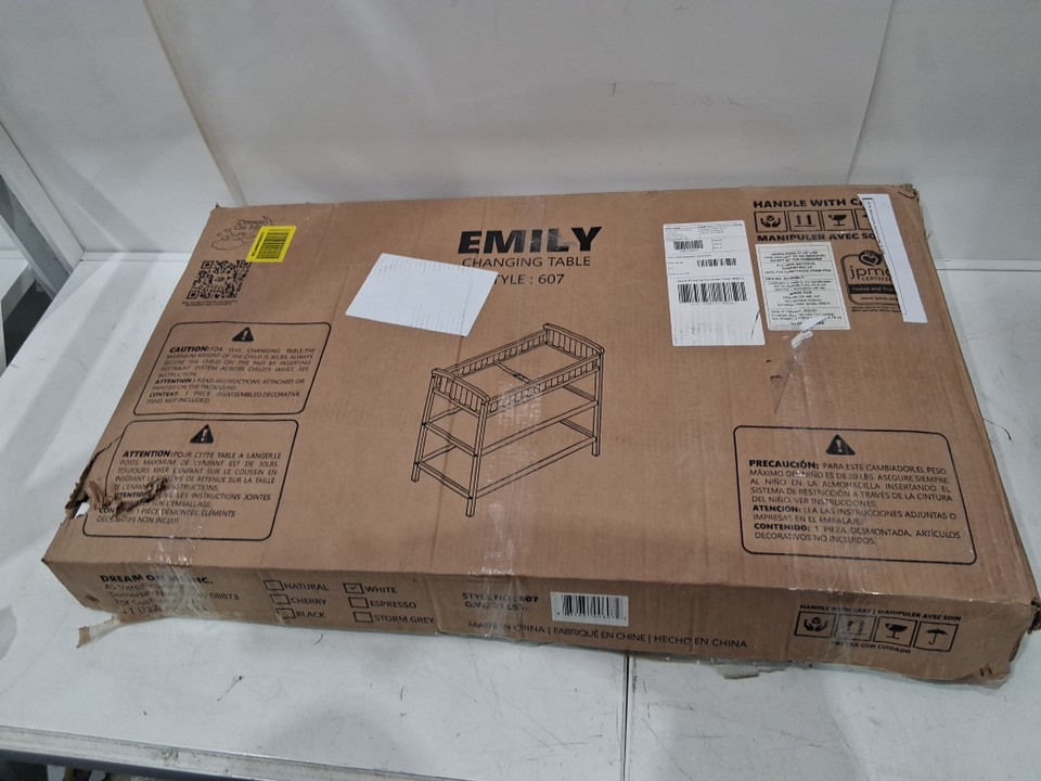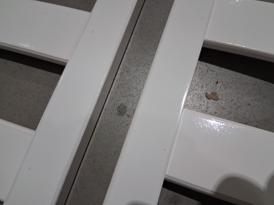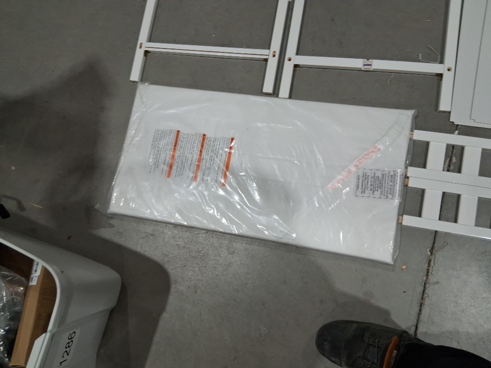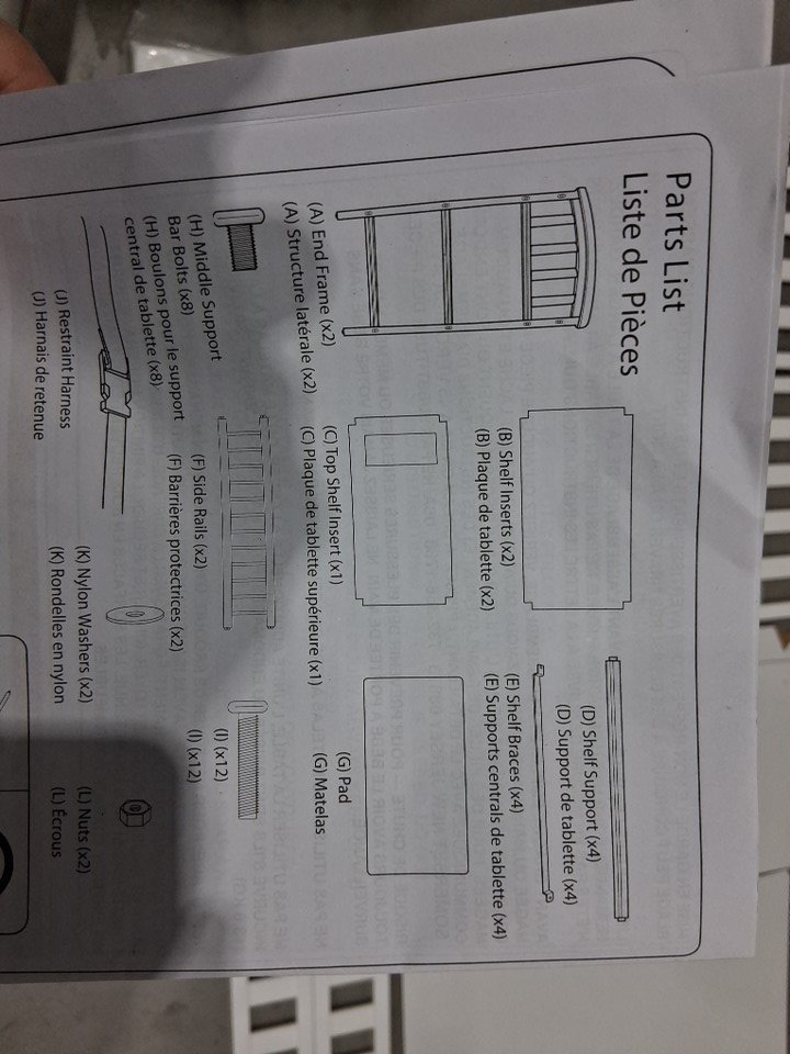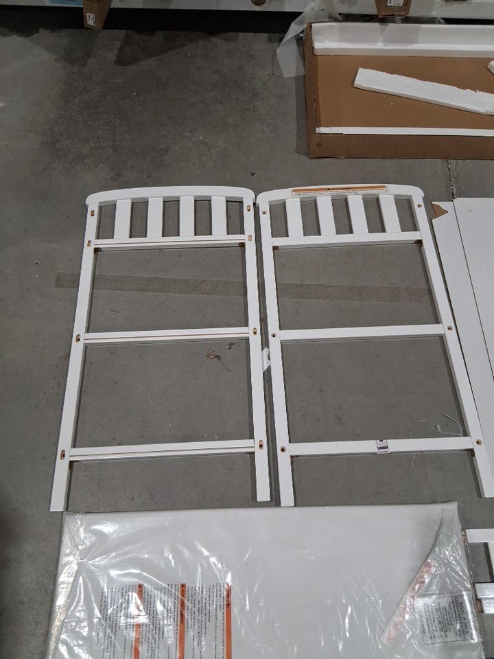 item has some chips missing out of the wood and scratch and scuff marks across the entire item. this indicates prior use / assembly hardware is missing for installation