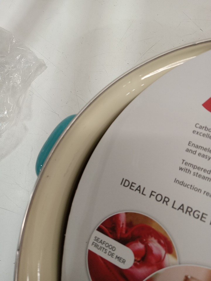 Scratch on the inside rim and chip in the enamel on the bottom, likely from shipping/handling without proper packaging.
