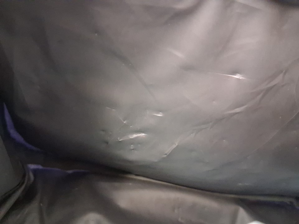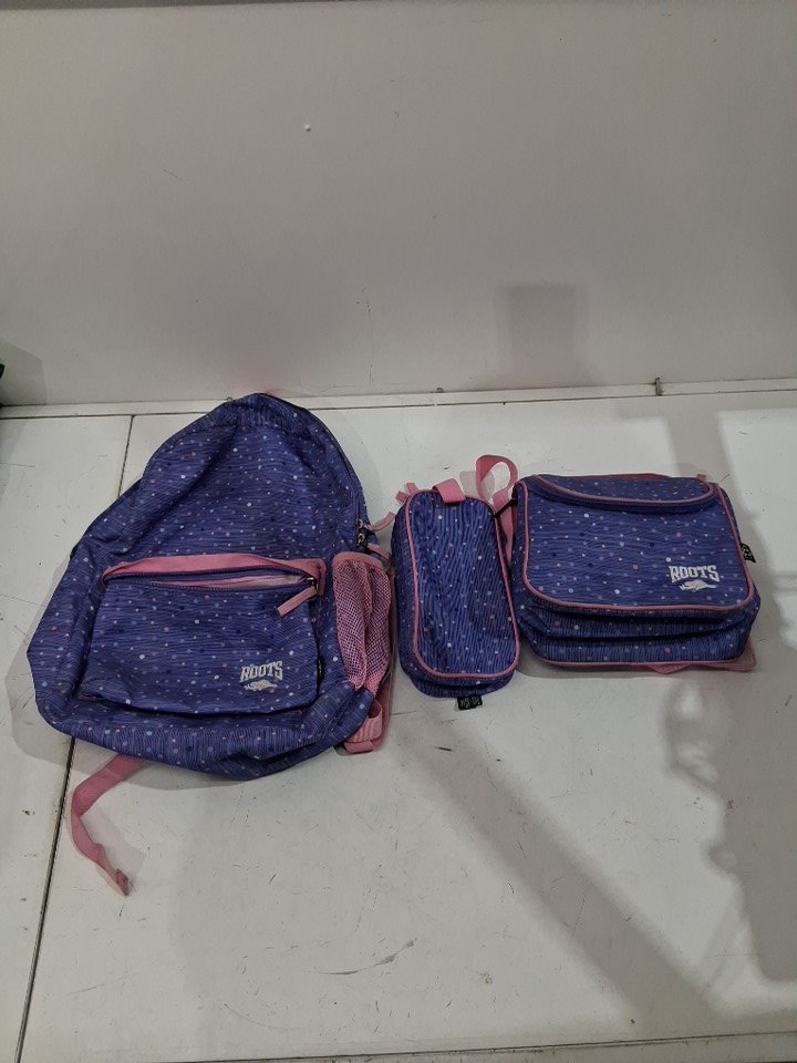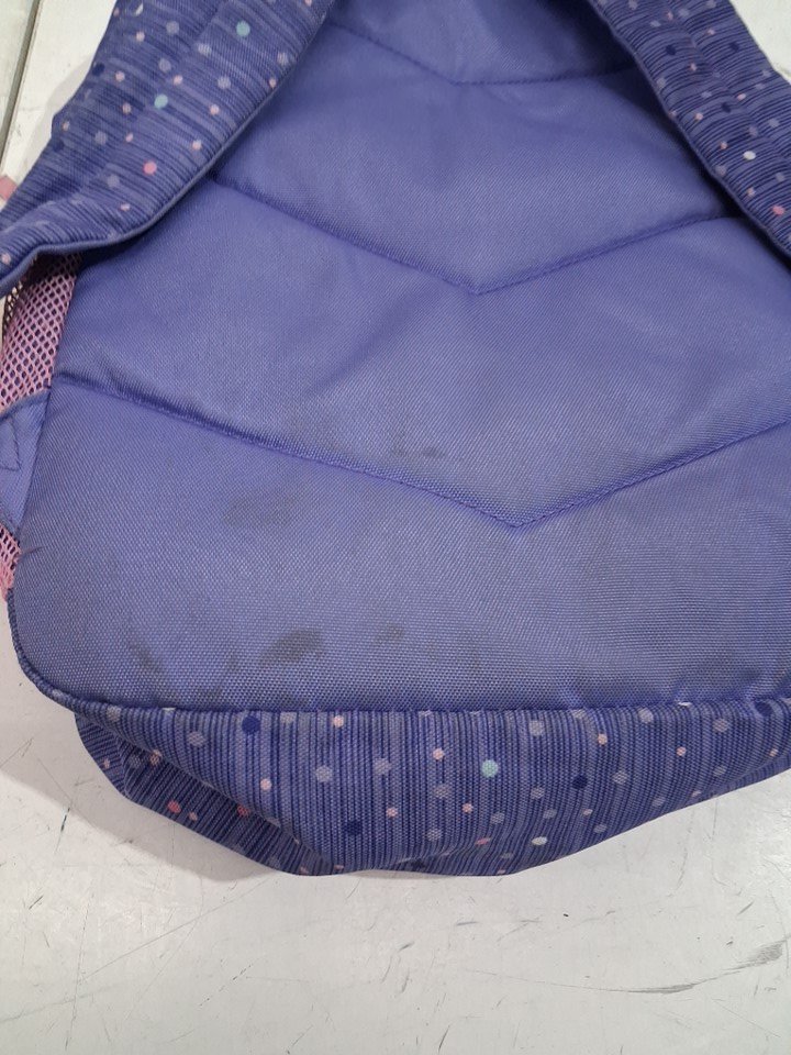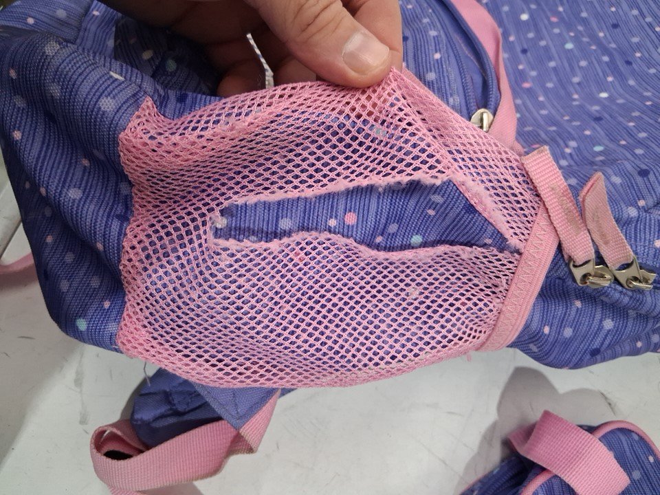 -Deep surface staining on backpack straps and bottom of backpack, back pack also has rip in side mesh pocket - Black staining inside the pencil case also some dark surface staining on surface area of pencil case - Lunch bag also has some surface staining and some dot like impression on the inside lining