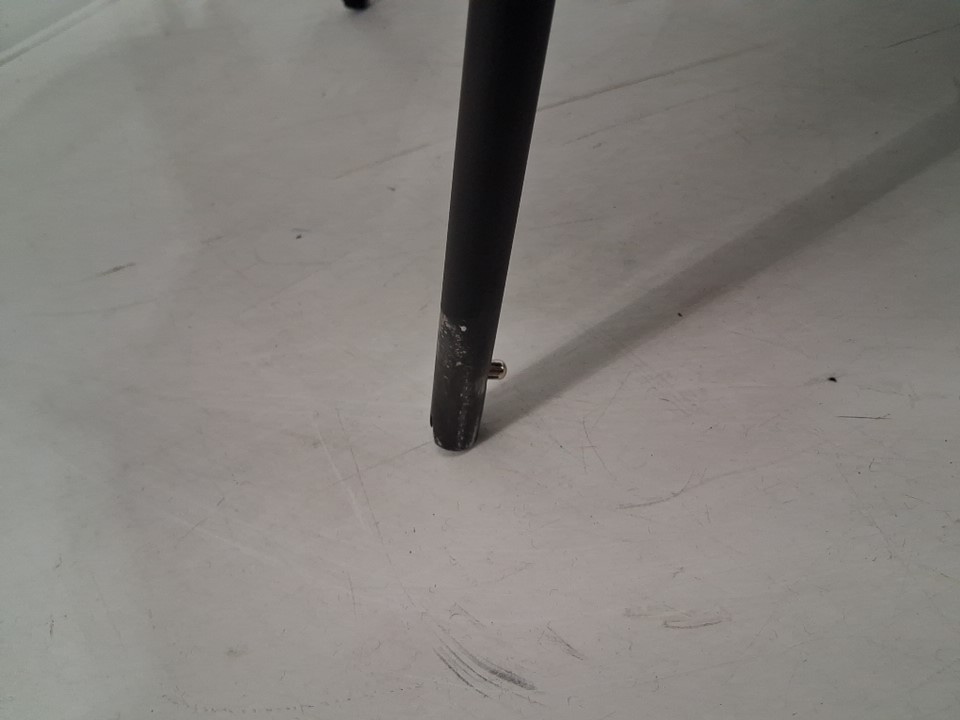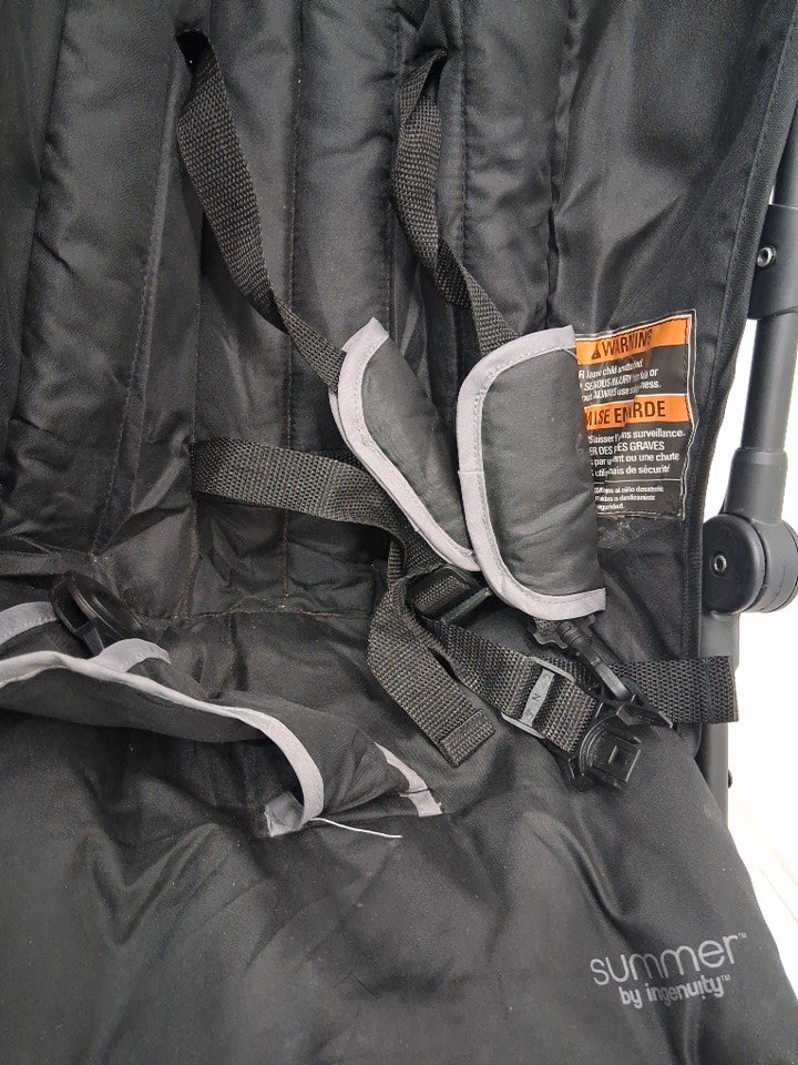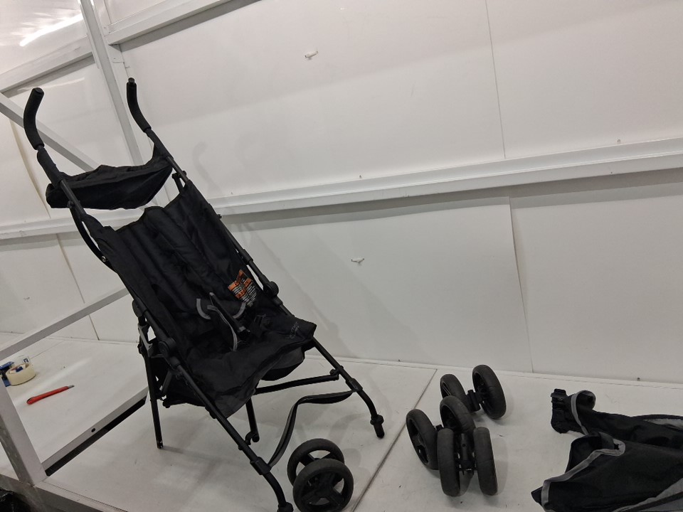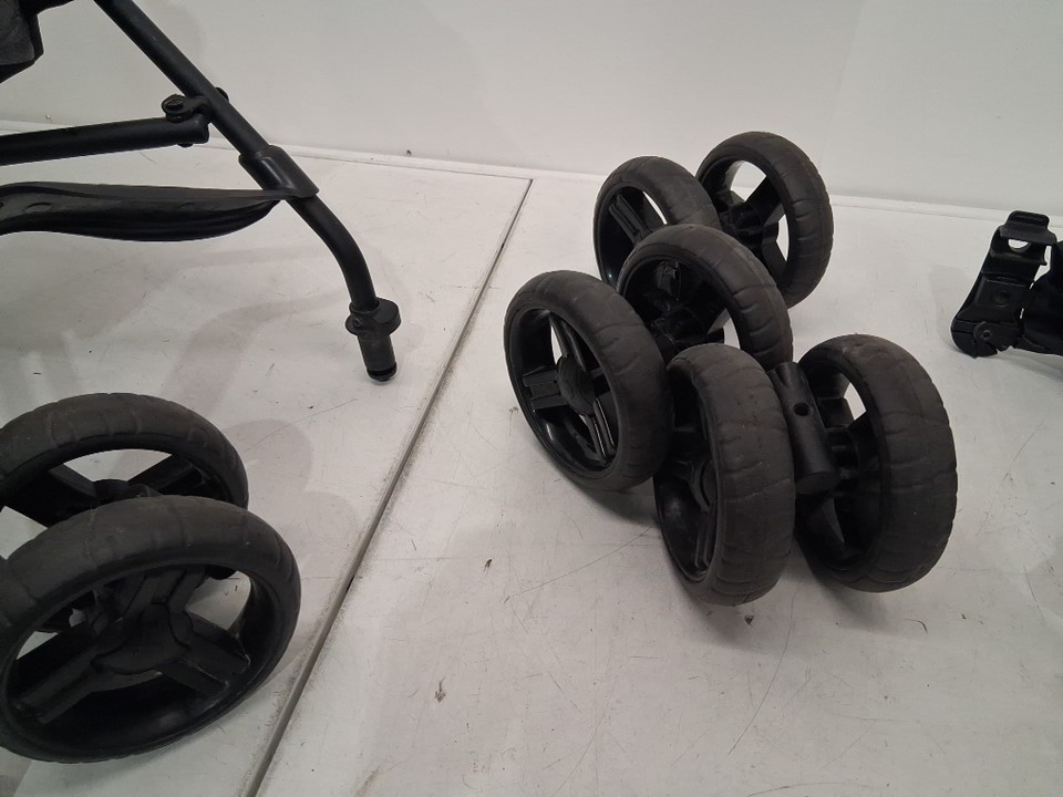Stroller wheels have visible dirt discoloration, paint scrapped off at ends from wheel connection, and seat has slight stains and dirt debris